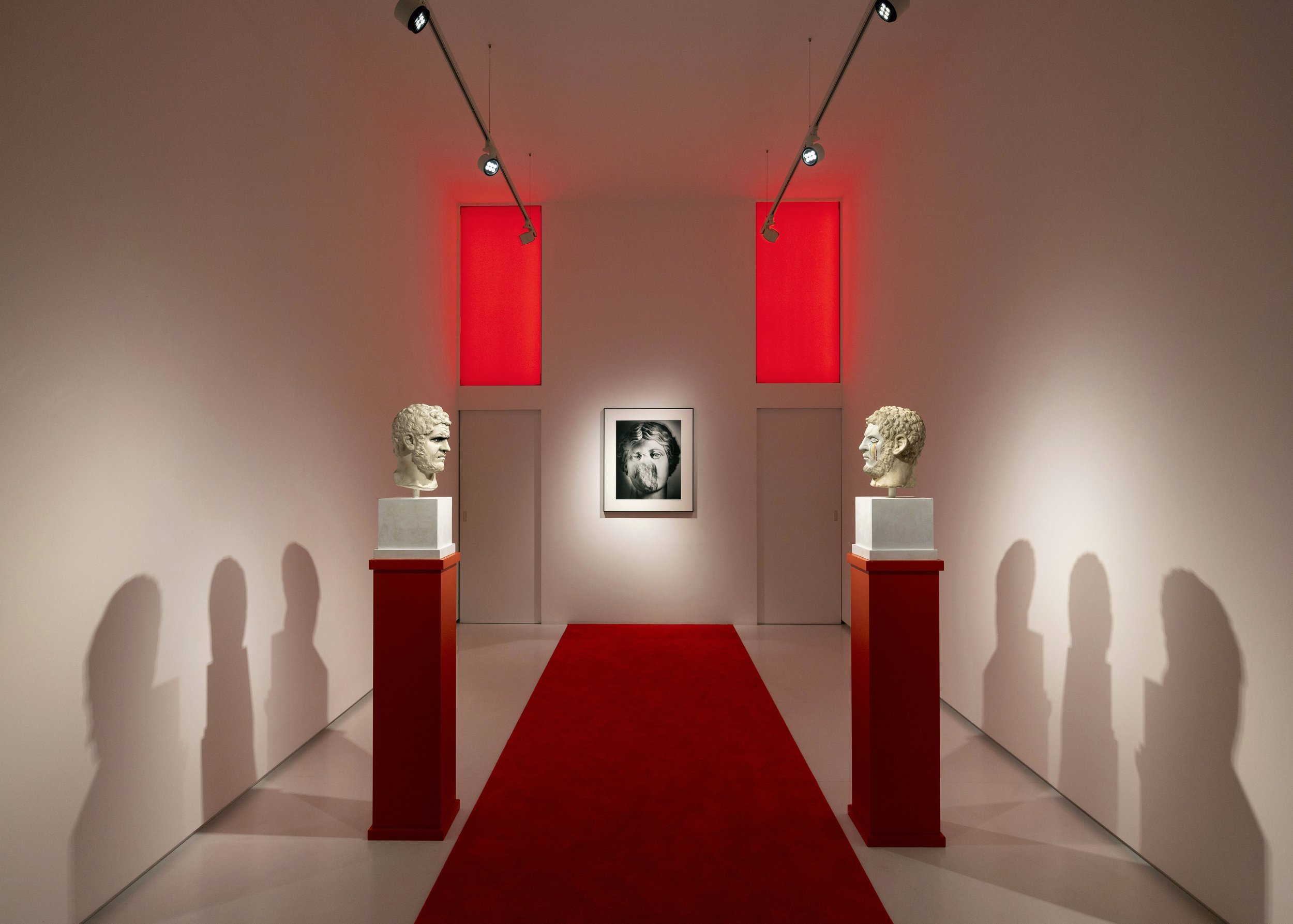 Nell’allestimento della mostra caprese, progettato da Filippo Bisagni, alla fiera guerriera, protagonista della fotografia di Mimmo Jodice, si accostano due busti in marmo del Seicento e del Settecento, raffiguranti l’imperatore romano Caracalla, con interventi di Francesco Vezzoli. La scelta dell’imperatore romano, avido e spietato, non è certamente casuale: Caracalla applicò infatti al fratello, alla moglie e al suocero, accusati di aver tramato alle sue spalle per ucciderlo, la pena della “condanna della memoria” che consisteva, secondo il diritto romano, nell’eliminazione di ogni traccia relativa alla storia personale dei condannati, decretandone quindi l’eliminazione dalla memoria collettiva, proprio come se non fossero mai esistiti. Nel confronto fra le opere dei due artisti il messaggio è forte e rimbomba nella piccola sala di via Vittorio Emanuele: narrazione storica, memoria e identità sono strettamente connesse. L’artista può riportare alla luce ciò che il tempo o la volontà umana hanno condannato al buio eterno.