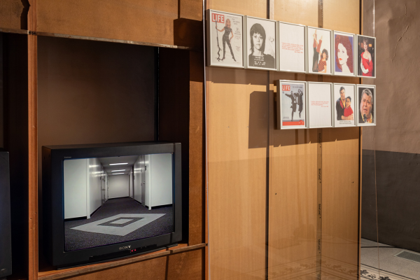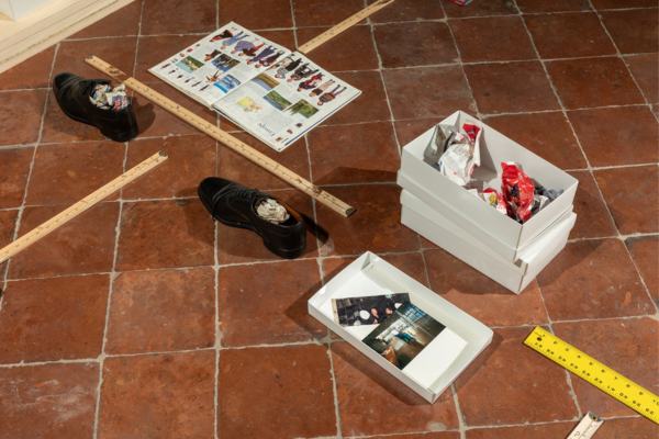 Il rapporto intimo con lo spazio, come luogo del corpo, è evidente nell’installazione Garden Path Sentence (2021), di Win McCarthy (USA, 1986), riadattata dallo stesso artista per una sala del primo piano della Fondazione: una sorta di ritratto-autoritratto attraverso oggetti personali, della cultura materiale effimera e del paesaggio urbano che tentano di misurare il perimetro della vita individuale.