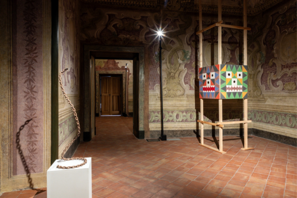 La precarietà, l’instabile equilibrio, la danza e il movimento dei corpi in relazione alla scena del clubbing e delle sottoculture di fine millennio sono, per la curatrice, i punti di partenza per leggere quella che è stata la produzione artistica internazionale in un momento di transizione a ridosso della caduta del muro di Berlino. I simboli e le icone della modernità, indebolite dalla perdita tardocapitalista delle certezze, puntellano il progetto espositivo che si sviluppa sui tre piani della Fondazione: partendo dalle complesse e affrescate sale del primo livello, Tanz Auf Dem Vulkan colpisce per l’ibrida selezione di media artistici, presentati secondo un altrettanto eclettico concept espositivo che fa dell’escamotage una caratteristica peculiare.