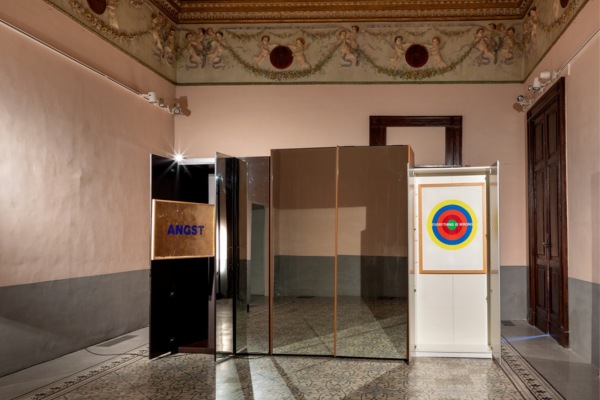 Si torna su queste vibrazioni salendo al secondo piano, nella sala dedicata al grande armadio, soluzione espositiva progettata dalla curatrice con lo studio d’architettura LAS RICAS. Questa familiare struttura, composta dall’assemblage di arredi recuperati nelle case napoletane, è il supporto su cui inserire, in un verso, l’installazione video a doppio canale Above The Grid (2000), di John Pilson (USA, 1968): un discorso sull’emancipazione dell’umano rispetto al lavoro meccanico e ripetitivo, superando la fredda rigidità della griglia. Nell’altro verso, quello frontale, fatto di chiuse ante specchianti a cui esporre i nostri corpi, guardiamo invece a un interno spazio dell’abito in cui sono inserite Everything is Wrong (2001) e Angst (2000), due ammiccanti gouache dalla dimensione di un poster dell’artista Henrik Plenge Jakobsen (Danimarca, 1967).