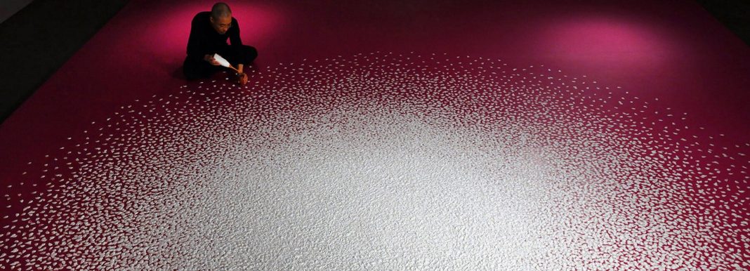 Motoi Yamamoto ha ideato questa incredibile installazione creando i 100.000 petali uno a uno. L’intero ha processo ha richiesto oltre 55 ore di lavoro, 9 giorni in totale. Il tema di Sakura Shibefuru sono i petali di ciliegio: l’artista infatti non si è concentrato solo sui petali ma anche sul ciclo vitale di questi fiori.