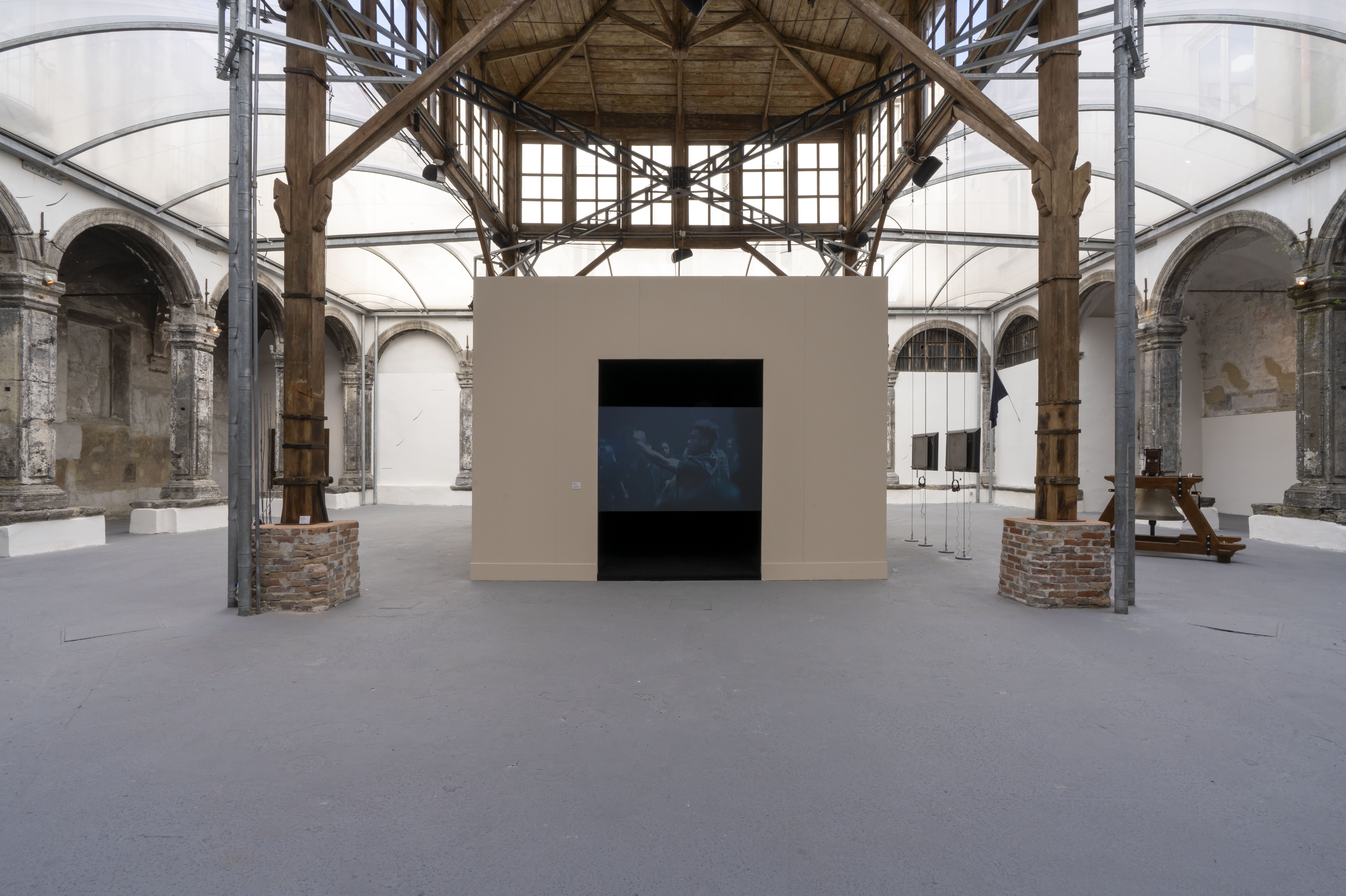 Questi lampi sembrano assorbiti proprio al centro, dove è in scena Les Indes galantes di Clément Cogitore, che fa da colonna sonora all’intera architettura dell’apocalypse joyeuse. Avvicinandosi al richiamo cadenzato dell’opéra-ballet composta nel 1735 da Jean Philippe-Rameau, si scorge la collisione tra epoche e codici orchestrata nel cortometraggio diretto da Cogitore: qui tutta la luce è completamente assorbita dagli spasmi dei corpi in penombra che “lottano” attraverso il Krump, una danza nata a Los Angeles negli anni ’90 tra i palcoscenici più violenti, che fa del corpo un archivio di tensioni.