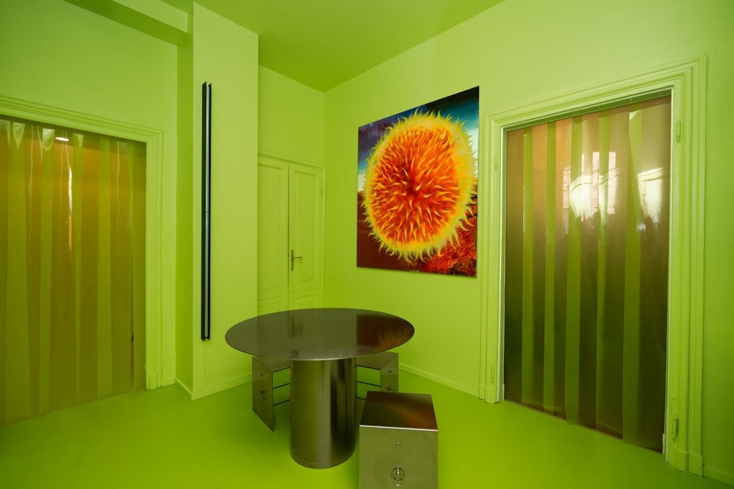 La personale Canzoni per animali d’appartamento di Diego Gualandris (Albino, Bergamo, 1993) è un esempio di come l’arte visiva e la gastronomia possano unirsi in un’esperienza sensoriale completa. Disposte nelle tre stanze principali dello studio dalle pareti verde acido, le pitture su tavola di Gualandris tracciano una linea d’orizzonte composta da paesaggi desertici e diradati, una “fine del mondo” illuminata da grandi Soli in rosso acceso. La stella è come un occhio che sorveglia un luogo a lei sconosciuto, come una telecamera accesa sul nostro quotidiano, racconta Gualandris: «Quasi tutti i titoli delle opere in mostra sono nomi di animali famosi, come Atticus Finch, il protagonista de Il buio oltre la siepe. Sono loro gli ‘animali da appartamento’, esattamente come noi». Il ciclo di Gualandris si ispira all’estetica fantasy e shi fi, dal film d’animazione Fantasia di Walt Disney, al pianeta Tatooine di Star Wars o al romanzo Dune.