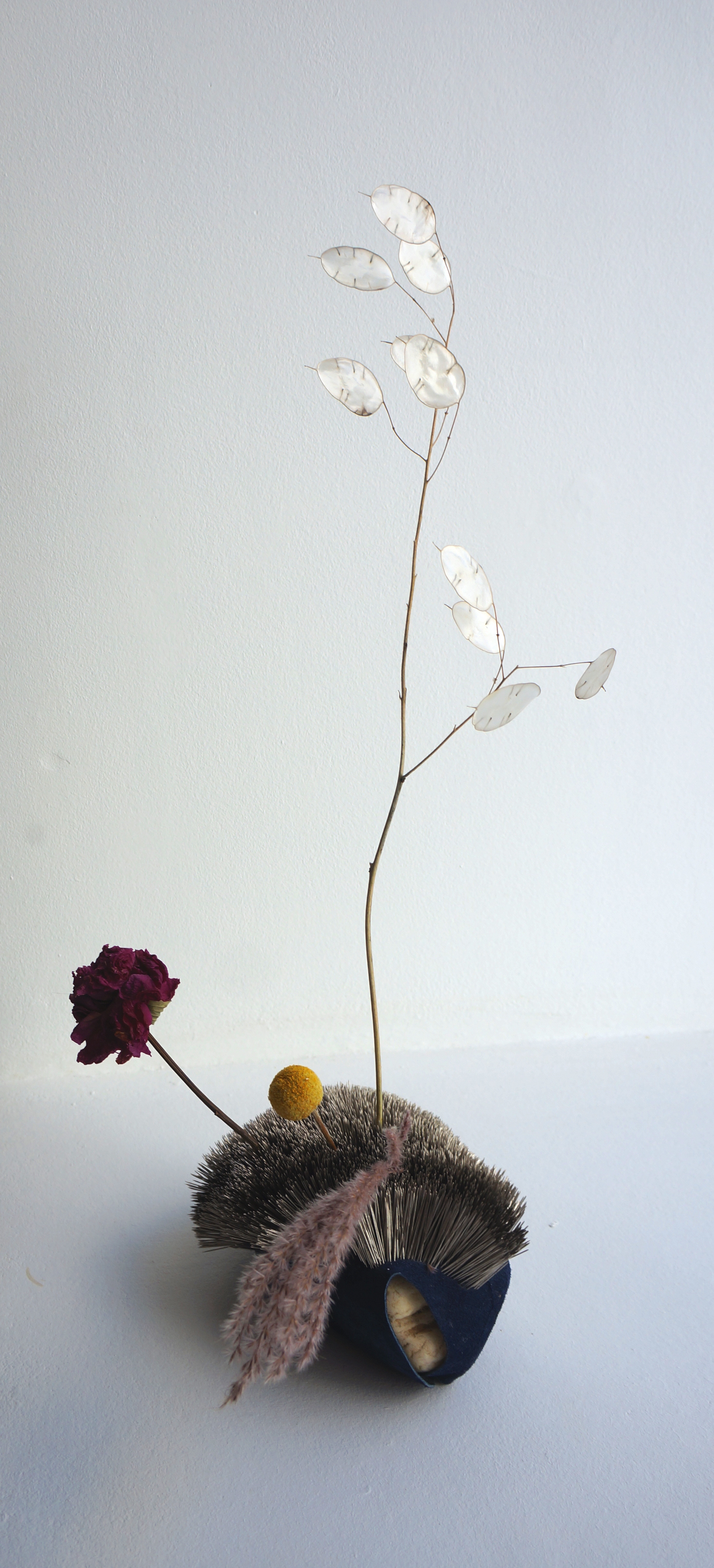 Torna il riferimento alla cultura giapponese con la citazione dell’ikebana, arte floreale che sublima la natura, nella piccola scultura omonima. Fonte d’interesse alla base di questi lavori è l’attrazione tra la materia corporea e il paesaggio delle nostre emozioni. Così, attraverso le sue opere Nawelle Aïnèche rende esplicita la relazione tra interno ed esterno; l’obiettivo è l’emozione e non la realizzazione finale. Bande magnetiche (per questa occasione recuperate esclusivamente da videocassette con film di Jean-Luc Godard), spilli da cucito e il telaio. Questi sono gli elementi fondamentali delle opere esposte in “Récolter l’instant de nos évidences”.