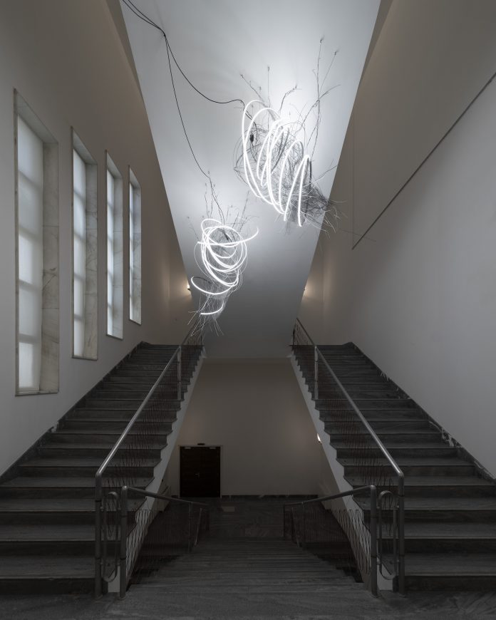 Ma ciò che abbiamo davanti, l’opera site specific, “Luciferasi”, di Alberto Tadiello, ha qualcosa di diverso. Come un pezzo nuovo, un primo innesto di una città futura, dominata da forme alternative, da pulsazioni tecnogene dotate di profondo romanticismo e che rifugge quella funzionalità fredda, domotica di una fanta-tecnologia alla Elvia Wilk.