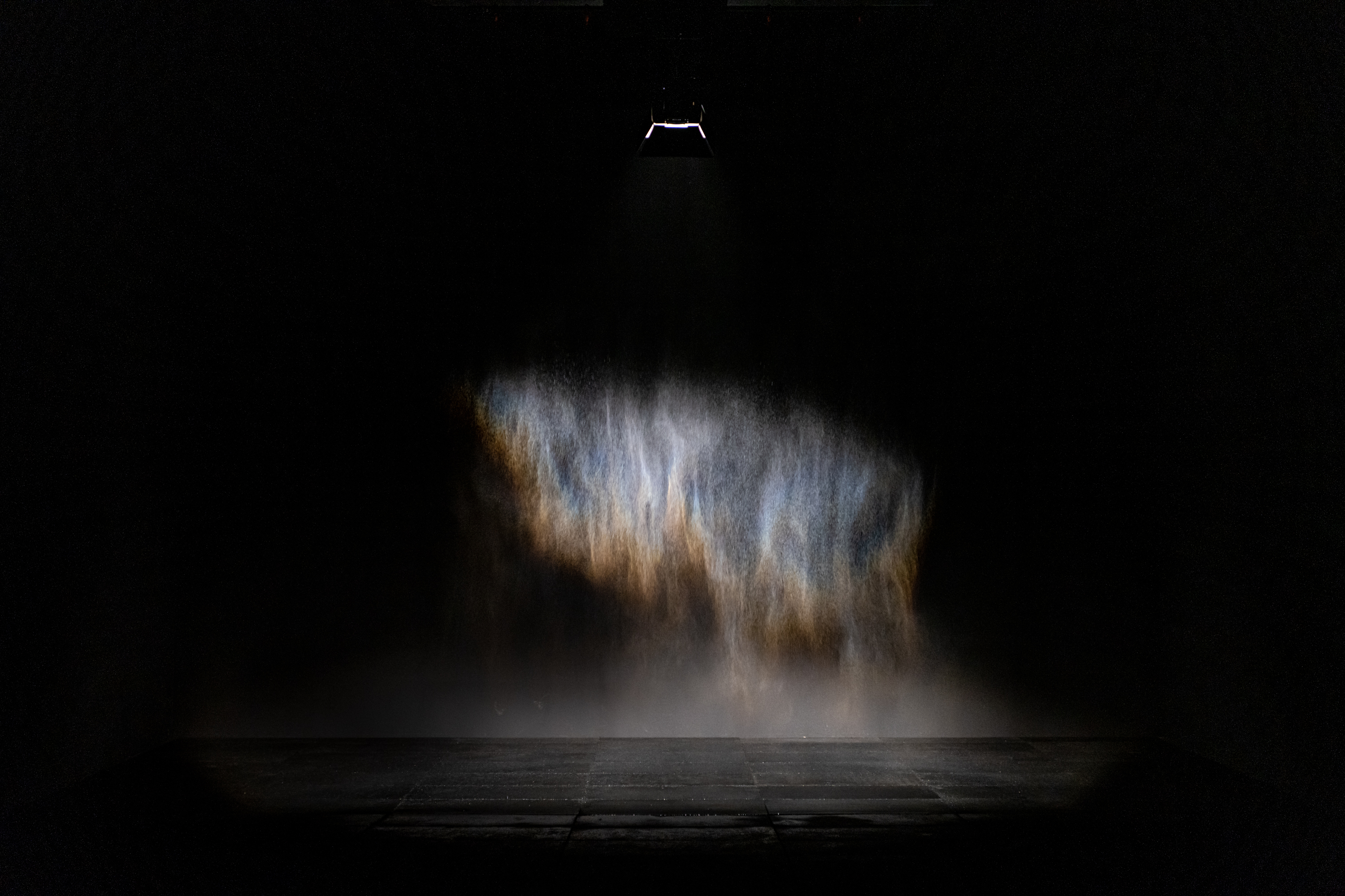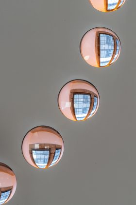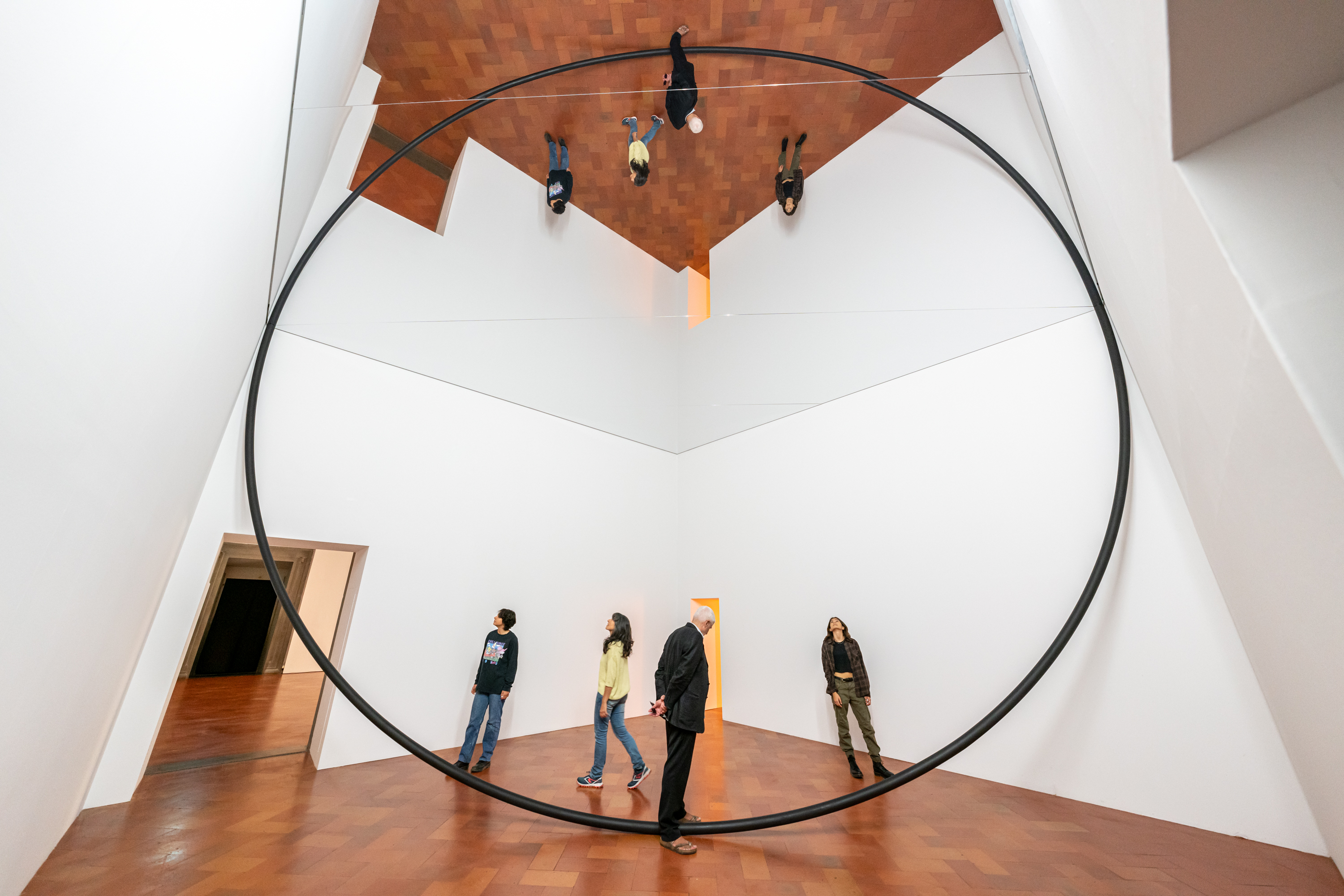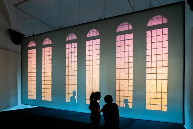 Una particolare attenzione è stata riservata alle finestre che con la luce sono state ricreate su alcuni pannelli. «Ho evidenziato le finestre, perché da lì arriva la luce e attraverso loro guardiamo fuori. Ci permettono di vedere il mondo. La finestra è una lente con cui guardiamo la realtà. Ho evidenziato i dettagli del vetro che sussurrano la storia di questa architettura che è un segno di ricchezza», spiega. E ritorna sul tema della realtà: «Siamo noi a scegliere come vederla. Anche in queste elezioni…». Come accade per le due opere nuove. Una site specific, fatta ad hoc per il cortile del palazzo: Under the weather. È una struttura ellittica di 11 metri a 8 metri di altezza in cui è stato creato l’effetto moirè, un fenomeno ottico nasce quando due o più griglie sono sovrapposte creando uno sfarfallio. Camminando con il naso in su lì sotto di possono vedere forme continuamente diverse, e ciascuno avrà le proprie in base ai passi che farà. «Quando guardi un moirè, in effetti stai vedendo ciò che vedi, ma senza il tuo movimento non ci sarebbe il moirè». Quindi ci permette un’esperienza unica per ciascuno di noi.