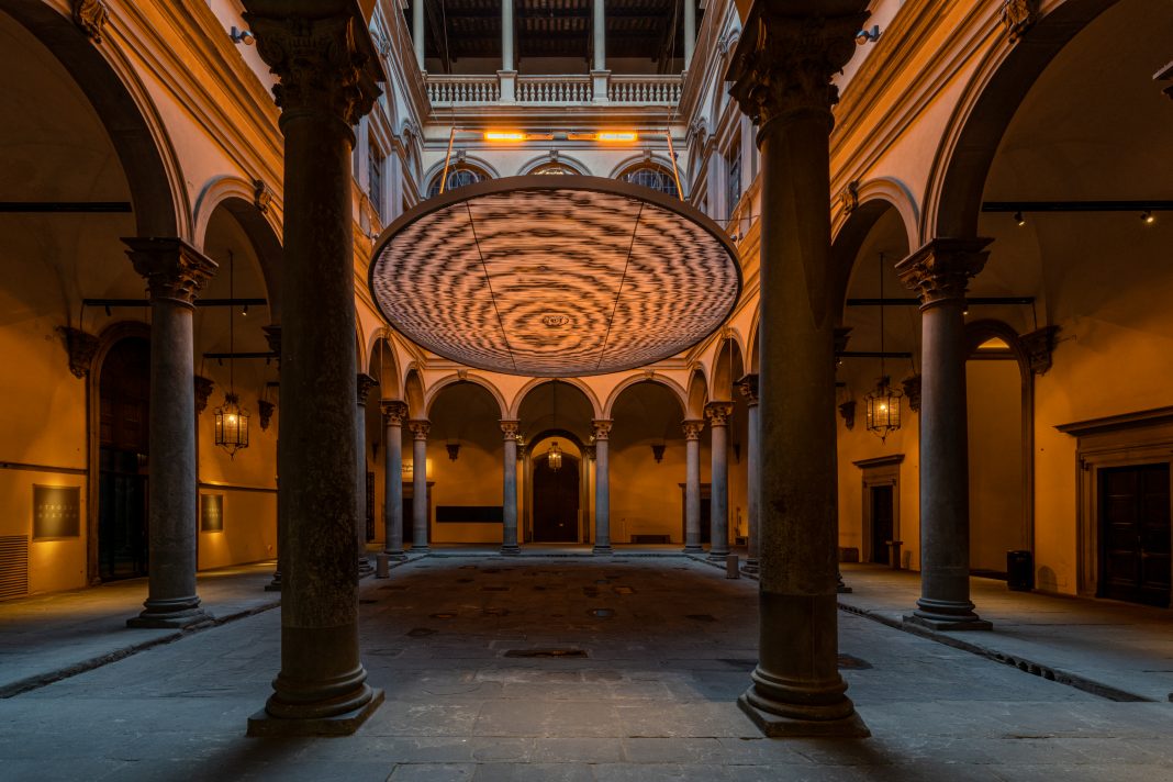 In questa mostra a Firenze fino 21 gennaio 2023 Eliasson ha deciso di includere lo stesso palazzo che la ospita il rinascimentale Palazzo Strozzi. Si è messo in ascolto della storia della città e della nostra cultura che all’Umanesimo e al Rinascimento deve quasi tutto. «”Nel tuo tempo” è un incontro tra opere d’arte, visitatori e Palazzo Strozzi. Questo straordinario edificio rinascimentale ha attraversato i secoli per accoglierci come co-produttore della mostra», spiega. Aggiunge Arturo Galansino, Direttore generale della Fondazione Palazzo Strozzi e curatore della mostra: «Per questa prima grande mostra in Italia di questo visionario artista il palazzo è diventato un corpo dinamico dove elemento architettonici come finestre, soffitti, angoli e pareti diventano protagonisti con installazioni che usano luce, specchi, filtri colorati».