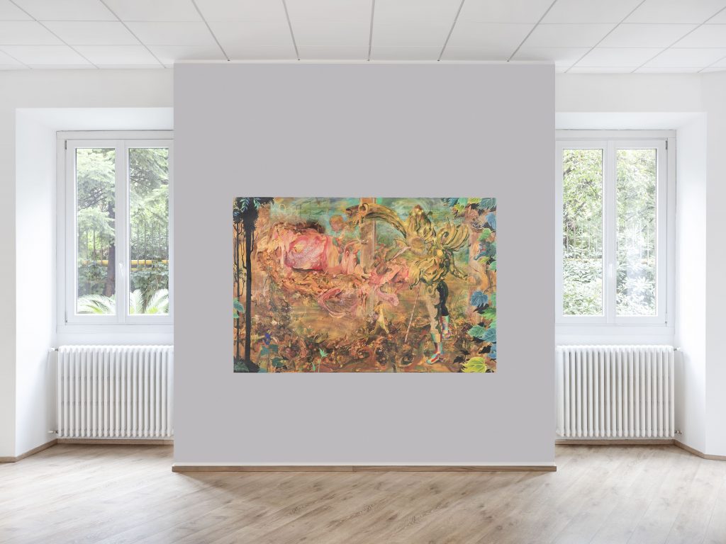 Le tele di Andrews funzionano come scenografie shakespeariane bidimensionali che giocano con una profondità inquieta, stratificata — flatnesses che non si accontentano di essere piane. La superficie, apparentemente florida e quasi rococò nella sua grazia ornamentale, cela sotto di sé un abisso di senso che solo chi accetta di sostare, di rallentare lo sguardo, può cominciare a sondare. Come nei drammi del Bardo, tutto accade in un teatro dove l’identità dei personaggi è già in crisi prima ancora che la storia abbia inizio. Le forme si sfrangiano ai margini, la figurazione si dissolve senza mai scomparire del tutto: resta lì, come un ricordo ostinato, come una parola non detta che continua a risuonare.