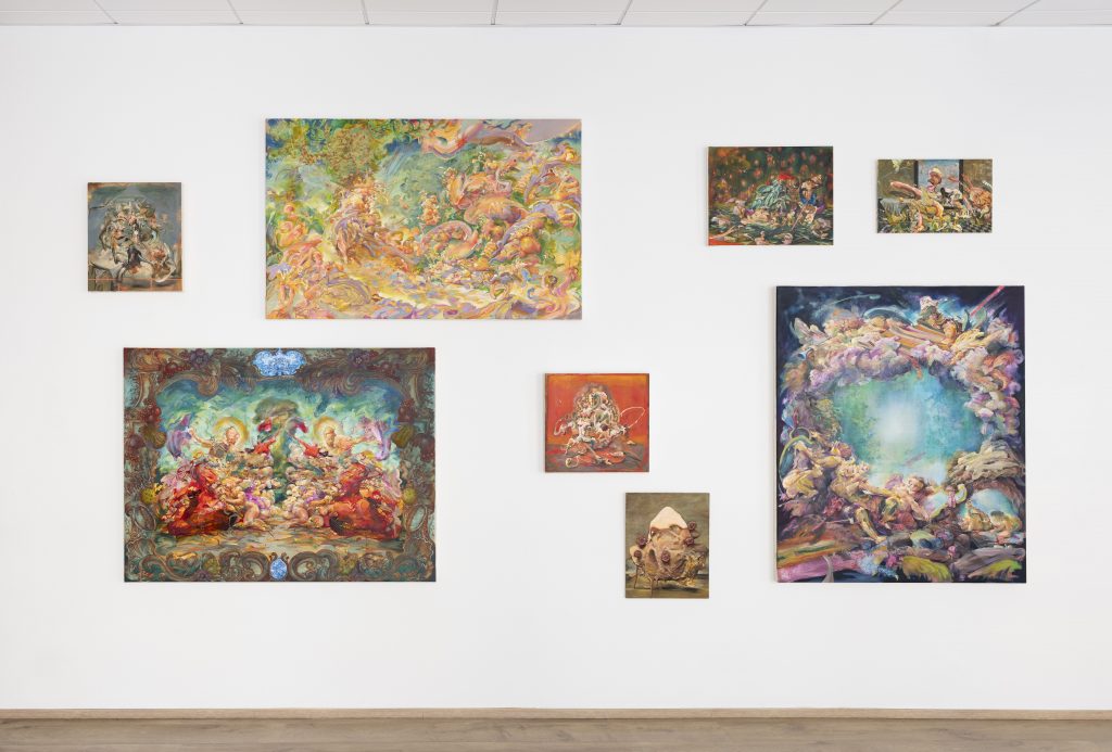 Andrews costruisce la propria pittura attraverso strati di cromie che si accumulano, si contraddicono, si richiamano in un movimento perpetuo di metamorfosi. Ocra e carminio, verdi sulfurei e bianchi di gesso, blu notte e gialli di tuorlo: ogni tono ha una temperatura emotiva precisa, una posizione nel racconto complessivo. La spettacolarità cromatica delle sue opere è sintassi prima ancora che bellezza. In questo la lezione dei pittori rococò — Fragonard, Boucher, Watteau, cui Andrews guarda esplicitamente, filtrandoli attraverso i film Disney visti con le figlie, da La bella addormentata in poi — viene assorbita e rovesciata: la grazia decorativa del Settecento francese diventa un involucro che contiene il contrario di se stesso, uno stile elegante che rende sostenibile un contenuto altrimenti schiacciante. Andrews conosce questo meccanismo dall’interno, e lo usa con consapevolezza tagliente.
