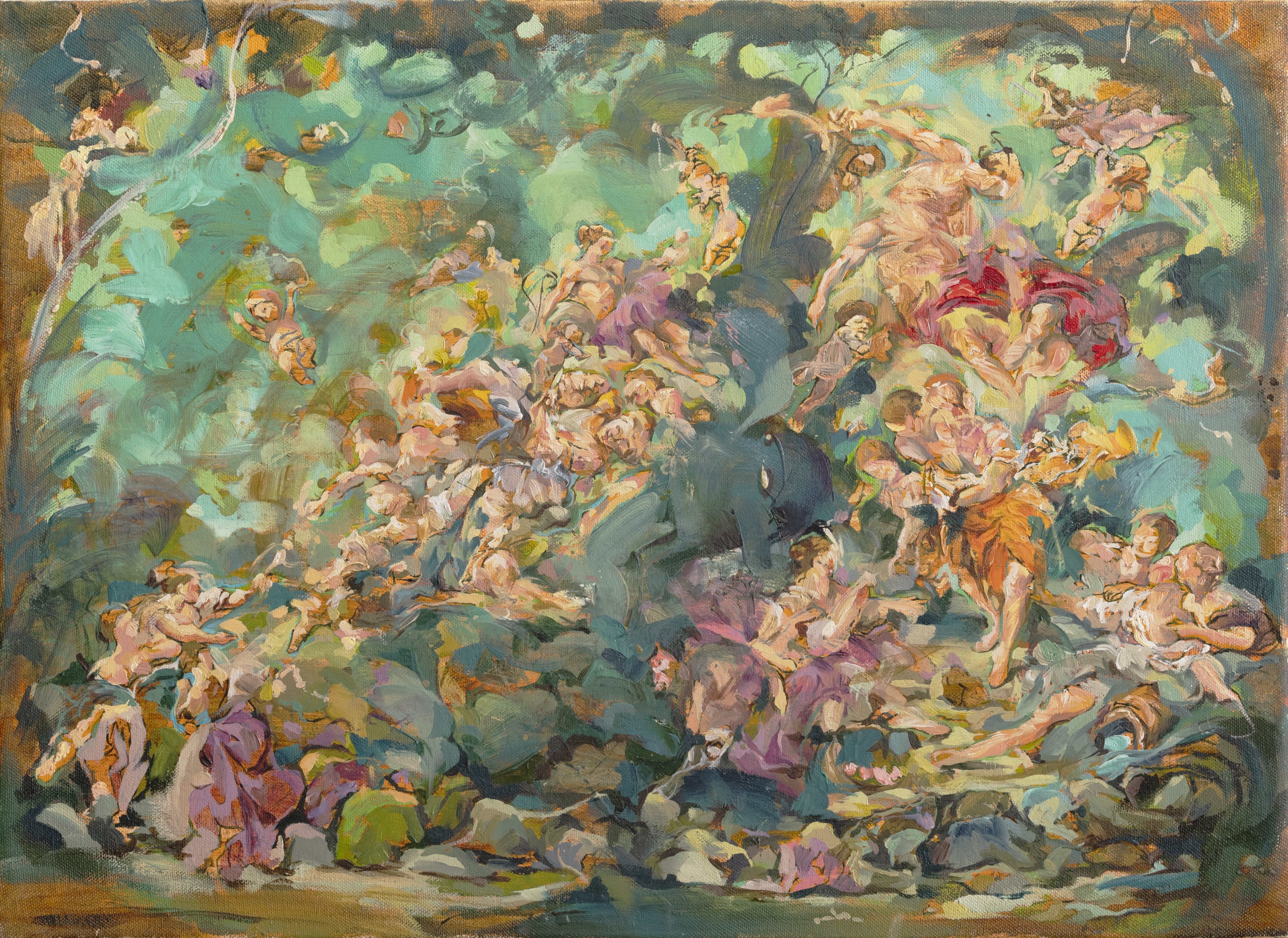 Iain Andrews, The Harpies’ Wood (2023), olio e acrilico su tela, 40 x 55cm. Foto Zima Studio; crediti Galleria Gaburro