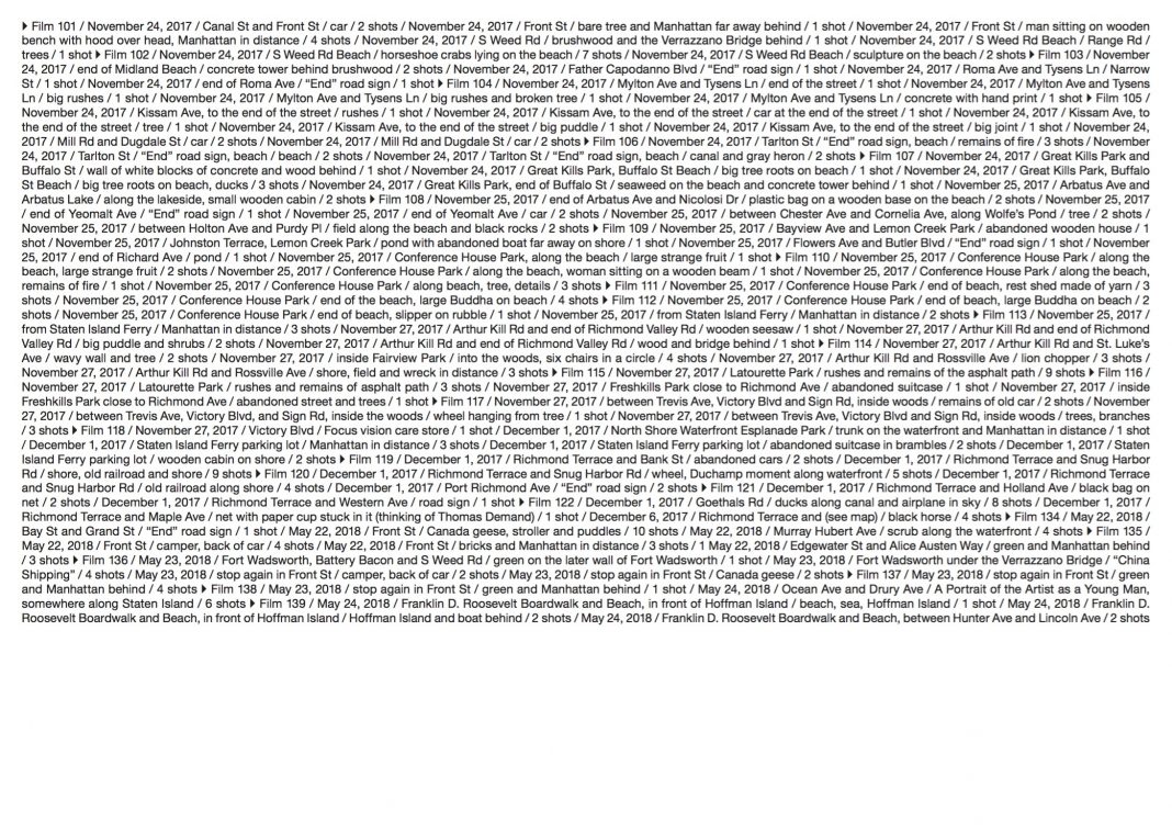 «Ho scelto di fotografare in analogico e medio formato perché́ cercavo una relazione forte e chiara con la scrittura, che resta nel mio lavoro una pratica quotidiana. Volevo tornare alle origini della fotografia e di alcuni autori che amo particolarmente (soprattutto l’opera immensa di Robert Adams) e fare un passo indietro nel tempo e immaginarmi una città che lentamente si svuota e torna il suono della natura. Il bianco e nero mi ha aiutato a fare questa sottrazione e a procedere per strati, velature di grigi. New York City, nelle sue zone di confine, è spesso una città caratterizzata da una tavolozza di grigi. L’oceano stesso è di un grigio scuro che si dissolve lungo le sue spiagge. Se dovessi ricominciare il mio viaggio intorno alla città nuovamente, forse fotograferei a colori. Non so. La questione del bianco e nero e del colore in fotografia credo segua processi mentali non sempre spiegabili a parole. Un po’ come con la pittura credo, il pittore non sa sempre il perché́ della scelta di un colore piuttosto che un altro. A volte sento con i colori, altre volte vedo meglio le tonalità̀ infinite della natura nella gamma dei grigi, dei neri e dei bianchi. Dipende anche molto dal soggetto che si vuole raccontare e da tutta una serie di considerazioni che sempre si riflettono con la nostra biografia in un dialogo serratissimo con il contesto attraversato».