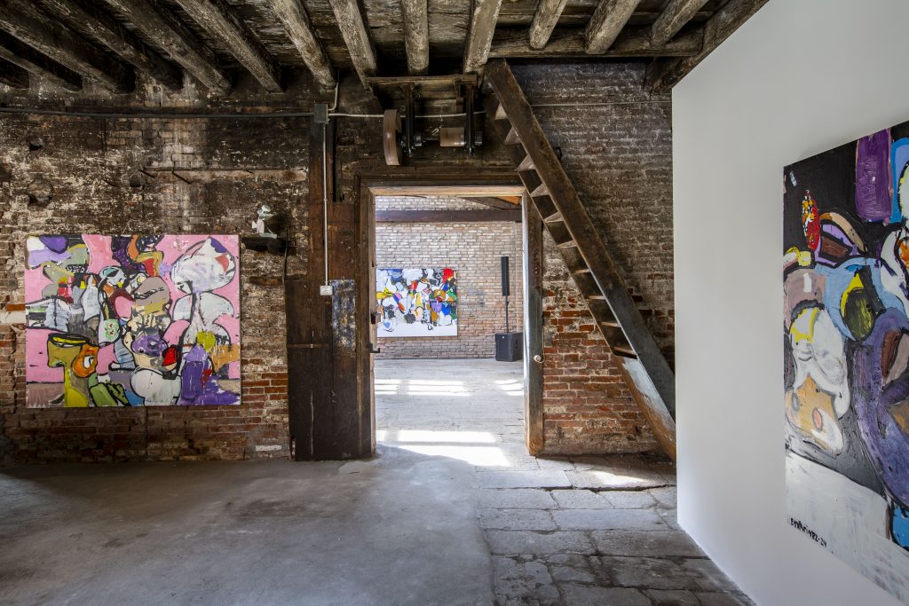 Nelle pareti della Fucina del Futuro, nove dipinti della stessa dimensione, creati appositamente per lo spazio espositivo, vogliono narrare la visione artistica di Eddie Martinez che ruota attorno al suo essere, errante e girovago. Emblema di questo è il suo dipinto, BF 2420#15, 2023 raffigurante una farfalla, che diventa immagine dell’esposizione, a riprendere dunque il concetto di Stranieri Ovunque, tema della 60. Biennale d’arte, simbolo di autonomia e cambiamento. Altro motivo ricorrente all’interno della sua produzione è un volto, reso tramite una sequenza di cubi, che ritroviamo più volte nei suoi schizzi e all’interno dei suoi dipinti, fra questi Night Maze, 2024.