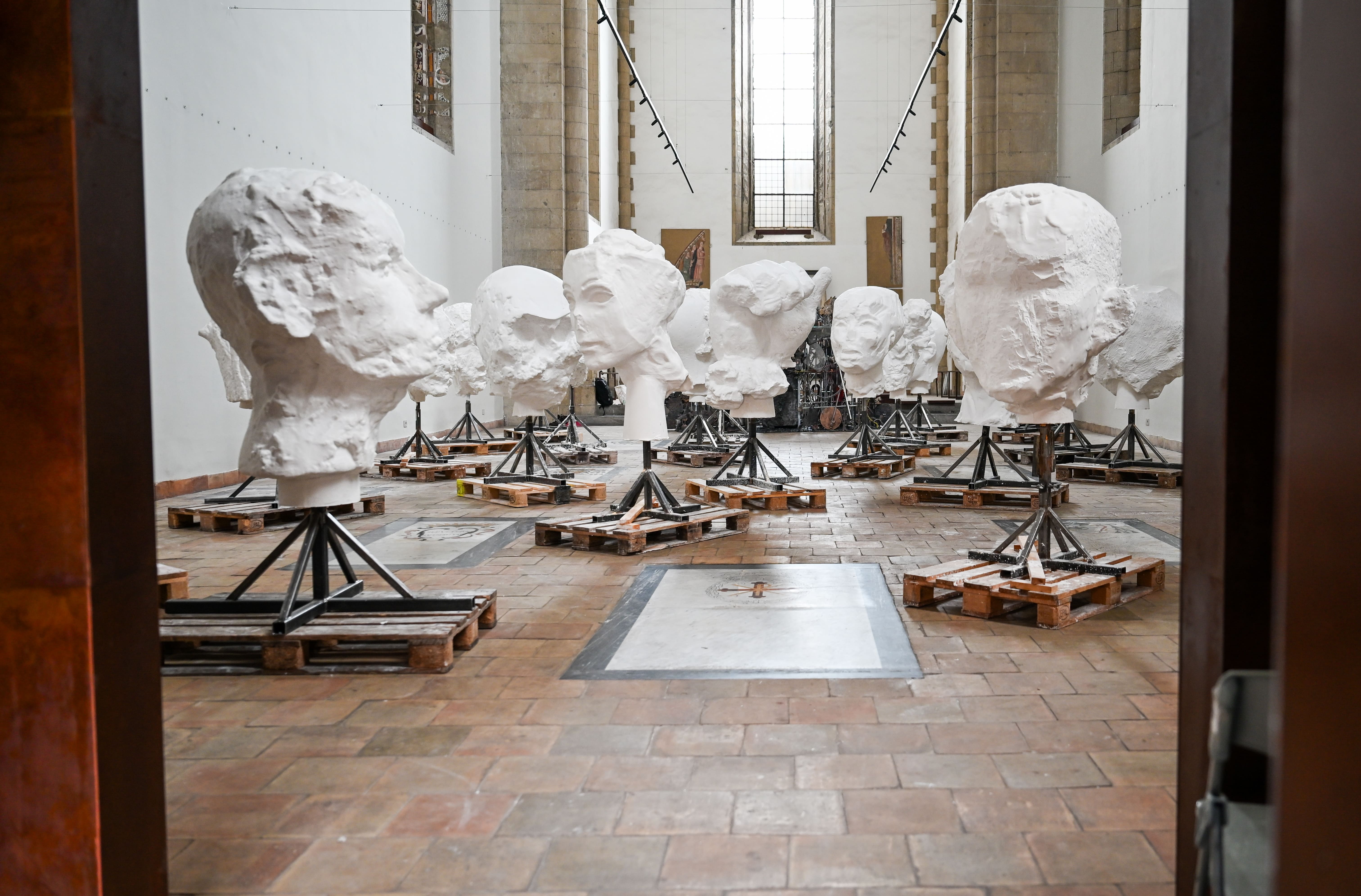 Elysian Fields è un proseguimento naturale e, in certi versi, un’estensione del suo modo di guardare al mondo e a se stesso in quanto artista. In mostra 29 opere dislocate negli spazi della Cappella Palatina, dell’Armeria, delle sale archeologiche e nella Cappella delle Anime del Purgatorio. Un percorso che incomincia con l’imponente istallazione della Cappella Palatina: le 23 grandi teste in gesso di ispirazione classica che occupano la navata entrano in voluto contrasto con l’opera inedita The Gate where Venus sleeps, una grande porta in bronzo e acciaio. La riflessione sulla riproducibilità – ancora attualissima – è qui ancora lampante, ma seconodo un’accezione assolutamente di rottura rispetto al movimento della Pop Art. Jim Dine fa una dichiarazione evidente: l’arte può essere riproducibile ma non impersonale.