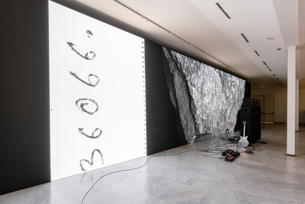 Alcuni ricordano il quasi insostenibile rumore metallico che, per duecento giorni, aveva riempito di suono il padiglione Australia all’Arsenale della Biennale Arte 2022, l’impresa live più lunga di Fusinato e volutamente logorante per i visitatori. Al PAC l’artista si esibirà sempre dal vivo, ogni giorno per tutta la durata della mostra, abbandonando la chitarra all’emettere dell’ultimo suono, che sarà riprodotto nelle successive ore in modalità ‘ambiance’, come un eco in attesa di essere ripreso il giorno successivo. Fusinato performa dandoci le spalle: come lui racconta, «Per me non c’è differenza tra fare il soundcheck e suonare il set. Mi esibisco con le spalle al pubblico per evitare distrazioni, per negare loro forme convenzionali di intrattenimento, che di per sé non mi interessano. L’intento è quello di fare qualcosa di scultoreo, riempiendo la galleria non di bronzo o marmo ma di vibrazioni che viaggiano nell’aria». La chitarra in alluminio permette un suono vivo, metallico e più ricco rispetto al legno. «È una scultura leggera, una scultura sonora vivente fatta di interpretazioni prima che immagini, e amplificata da un impianto Science, costruito a mano da un amico di Seattle».