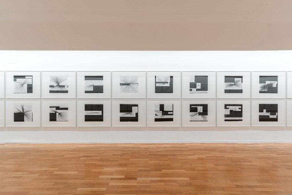Nella galleria è invece esposto il famoso progetto MASS BLACK IMPLOSION, in corso dal 2007. Ogni tavola riproduce partiture d’avanguardia preesistenti che Fusinato trasforma in composizioni noise, disegnate in formato 1:1. Tra gli spartiti vediamo uno Iannis Xenakis, Cage, Roman Haubenstock-Ramati, Anestis Logothetis, tra gli altri. Fusinato collega con una linea casuale ogni nota originale dello spartito a un punto arbitrario, andando a costruire una nuova composizione in cui ogni nota verrà eseguita simultaneamente, in un unico fragoroso momento di condensazione sonora. A completamento del percorso espositivo, una selezione di pubblicazioni in vinile in formato LP da 12 pollici dell’artista, con registrazioni realizzate dal vivo dal 2009.
