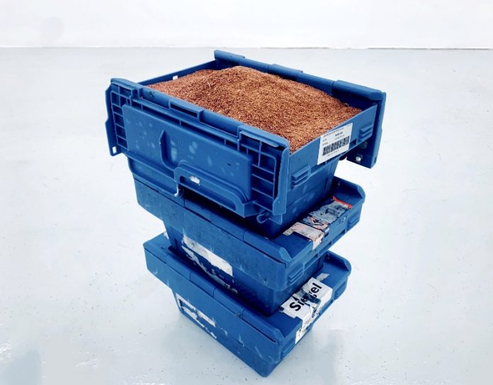 Intorno a tale concetto ruota, in particolare, l’installazione Domination-flux (2019) di Daniel de Paula che, con tre scatole da stoccaggio contenenti rame granulato estratto dai cavi per la comunicazione dei dati ad alta velocità, traduce la mercificazione digitale dell’uomo e la soggettività dell’artista in un oggetto concreto che ha il suo stesso peso corporeo.