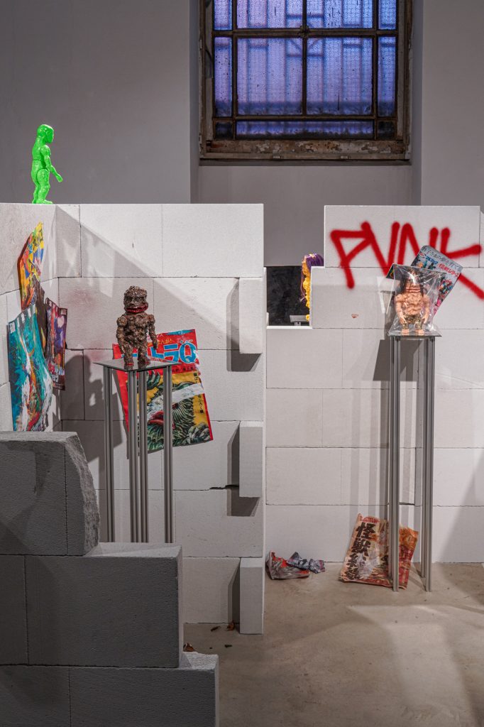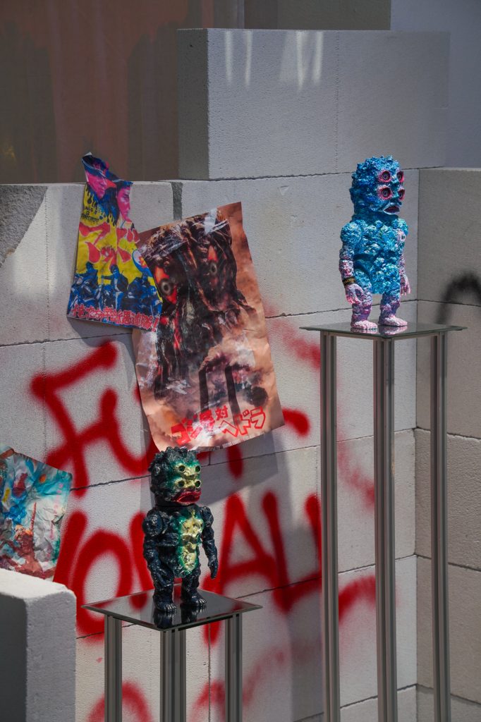 In mostra, all’interno di un allestimento in pieno stile underground, tra graffiti e poster giapponesi, troviamo MieuxNA, l’ultimo sofubi realizzato da Arai (scomparso nel 2023), accanto alle tele di Ayano Yamamoto. Nonostante l’aspetto infantile, il personaggio rappresenta un uomo di cento anni. Arai aveva pianificato di presentarlo alla Tokyo Art Fair insieme ai dipinti di Yamamoto, pensati come controparte visiva, ma la sua morte ha impedito la realizzazione del progetto. Questa figura si distingue nettamente dalle precedenti: se prima i soggetti erano uomini o ominidi, qui ci troviamo davanti a un design che si avvicina al femminile, pur presentando genitali maschili.