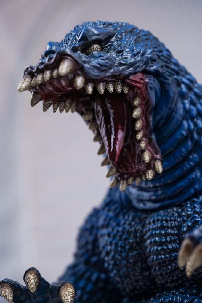 Partendo dalla figura emblematica di Godzilla, Arai inizia a modificarne alcuni elementi. Ed è proprio qui che emerge ciò che lo rende così straordinario: in un Paese e in un settore così legati alle regole, lui, le regole, le infrange. La sua tecnica distintiva di pittura a mano, conosciuta come Arai-nuri, è emblematica del suo lavoro: una stratificazione espressiva fatta di superfici tattili e profondità cromatiche inconfondibili. Se una scultura standard prevede tre o quattro passaggi di colore, nelle sue opere se ne possono trovare decine, con l’obiettivo di rendere le sculture vive e matericamente più profonde. Un’altra particolarità è l’aggiunta di elementi esterni non in vinile, ogni volta differenti: capelli, occhi, ma anche accessori e indumenti come polsini borchiati, cappelli, chiodi o capi che richiamano, in modo ironico, le divise del McDonald’s in varie colorazioni.