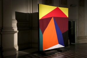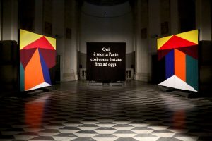 Tra potere rituale e ripetizione, forme e colori si stagliano nella loro identità di codici percettivi, segmentati nei territori astrattivi di unità geometrica, composti secondo morfologie dalla forte valenza simbolica richiamanti l’ambito sacrale e sapienziale di antiche culture algoritmiche. Una sintassi ritmica e una drammaturgia oratoria amplifica la riflessione aurorale che accompagna le opere nelle parole del filosofo Franco Berardi, riverberate nella Sala come predicazione omiletica. In esposizione fino al 15 luglio Don’t You Forget About Me conduce lo sguardo in una interrogazione interpretativa sulla stessa esperienza visiva, sulla costruzione e articolazione morfologica del fare artistico nella dimensione mnestica e tradizionale, sulla base di un continuo e perpetuo nuovo ricrearsi, non da ultimo ponendo ad analisi il concetto autoriale, in confronto e associazione con l’intelligenza artificiale, nella sua potenza veicolatrice e pervasiva.