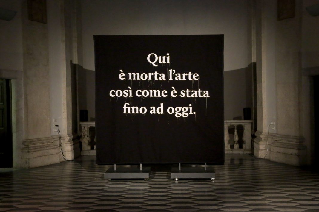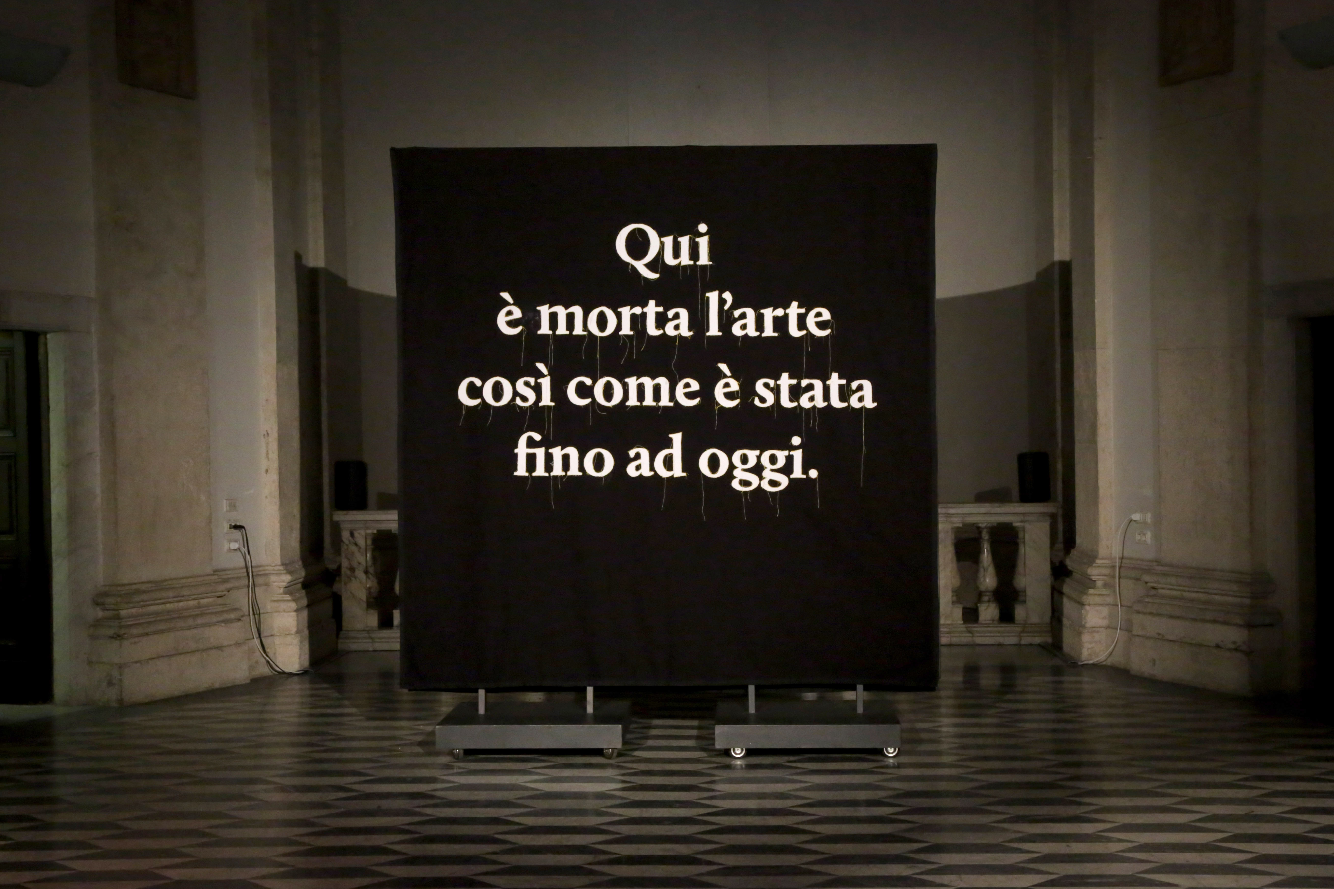 L’epitaffio generato dall’IA e ricamato su stendardo al centro della sala, come in un’ideale pala d’altare dal linguaggio sintattico visivo, diviene sistema estetico cortocircuitale in disputa con l’hic et nunc che si sfalda e ricuce ai margini di ogni costruzione formale, in favore di una atemporale e assoluta presenza, affermata e richiamata all’interno di un edificio di culto sconsacrato. Ai lati dell’annuncio funebre l’ordine geometrico e la sua negazione si congiungono a quello testuale nei due stendardi ricamati a mano nei colori primari fondamentali.