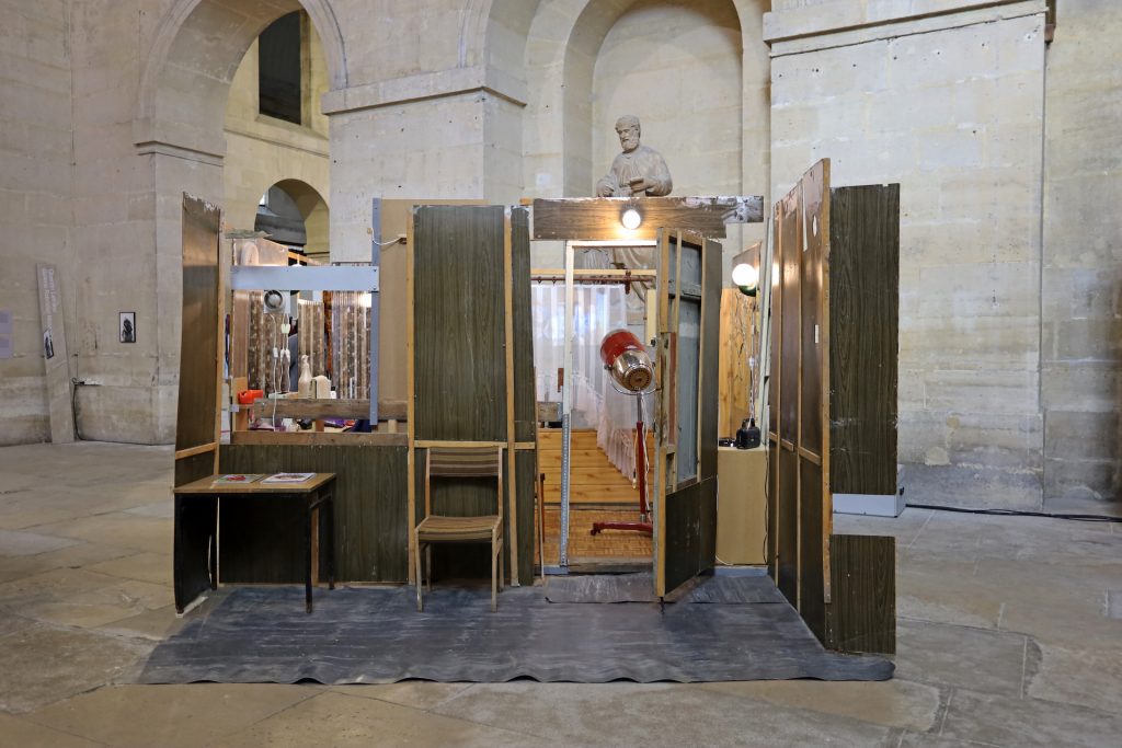 Lo spazio della Chapelle Saint-Louis ha una pianta a croce greca con quattro navate e 4 piccole cappelle. È articolato per quest’occasione in un’anticamera, seguita dalle due navate che tagliano perpendicolarmente lo spazio e da 4 cappelle, coperte da altrettante cupole, che circondano uno spazio centrale. Il cuore è quindi la sala ottagonale che, ben illuminata dall’oculo della sua imponente cupola, ospita una toccante performance: This Mortal House Building 3 di Maria Stamenković Herranz. L’artista bendata costruisce una spirale di 1,440 mattoni crudi; la spirale è simbolo che si collega anche alla numerologia di Fibonacci e alla perfezione dei costrutti naturali. Lo sforzo della costruzione viene alimentato dalla parentesi temporale in cui si svolge, 7 ore, dalle 11 alle 18 del 21 ottobre.