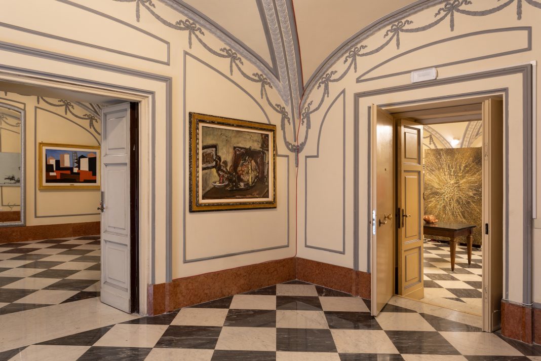 Nella prima sala, allestite su un tavolo parte dell’arredo originale, le opere di Maryla Lednicka – in mostra con un raro pezzo degli anni ’20 – e Namsal Siedlecki indagano i processi di trasformazione della materia a partire dalla metamorfosi alchemica degli elementi naturali. Nello stesso ambiente, le opere di Paolo Canevari e Ferruccio Ferrazzi si confrontano sul tema del paesaggio, mentre l’eco dello sguardo sulla natura riverbera nelle sperimentazioni fotodinamiche di Enrico Prampolini, in dialogo con un dipinto di grandi dimensioni di Alberto di Fabio. Il percorso narrativo si arricchisce aprendosi verso l’immaginario favolistico, dove la figura femminile si evolve da una sospirata assenza verso una graduale affermazione, attraverso le tavole di Liliana Moro, il dipinto di Kati Castellucci e le opere di Carlo Socrate e Marinella Senatore. Ancora i temi del lavoro, del paesaggio urbano e della natura morta si intrecciano nelle opere di Eva Marisaldi, Giulio Turcato, Filippo De Pisis e Nico Vascellari, che conducono verso la fine del percorso espositivo dove l’eco delle ricerche concretiste risuona nella giustapposizione tra due splendidi dipinti di Carla Accardi e Atanasio Soldati.