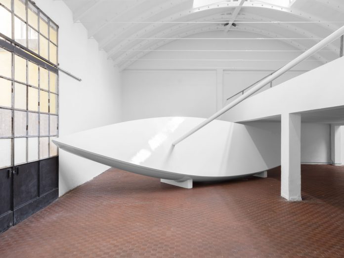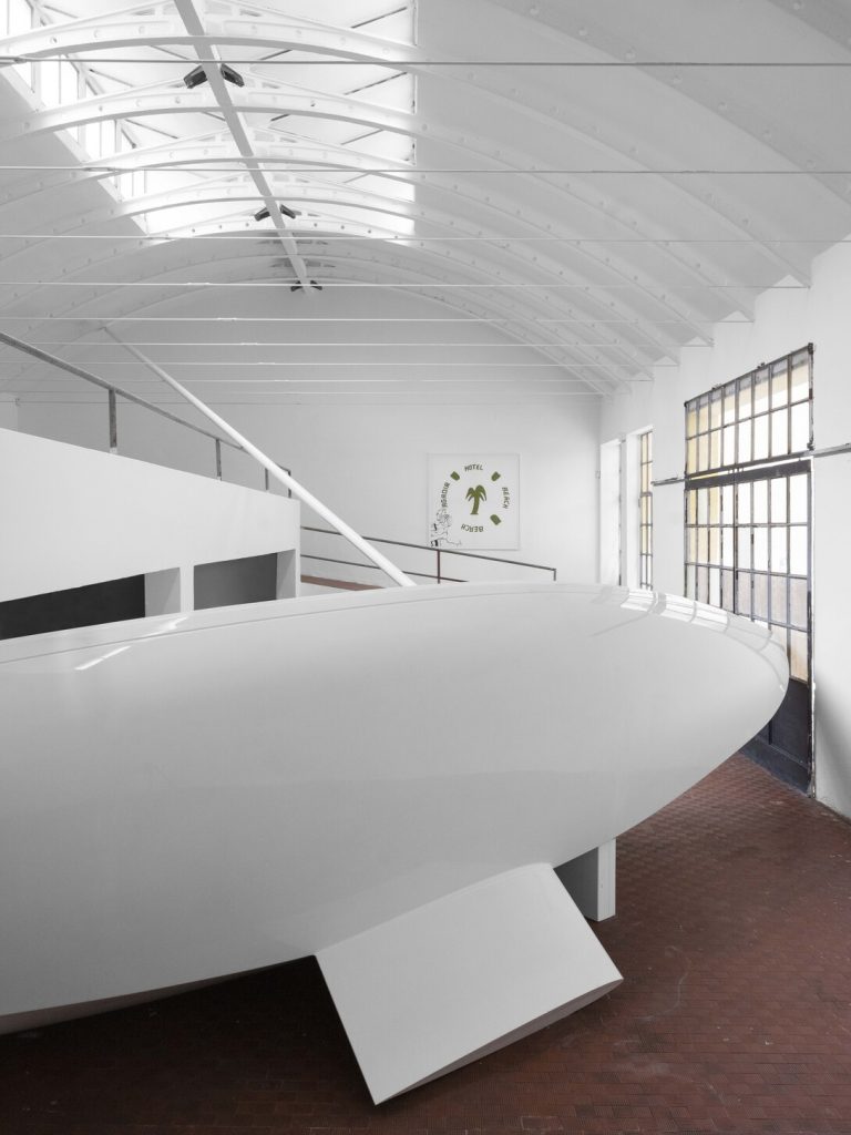 Arenata e incastrata al millimetro, una (vera) grande banca a vela in vetroresina bianca taglia in due lo spazio della galleria. Simbolo di una fuga interrotta e impossibile, colta in una turbolenza senza vento apparente, come un oggetto in fuga ma trattenuto. Forse rappresenta l’ambizione di un’umanità che, snaturata e priva di ormeggi, si disperde nella vastità?