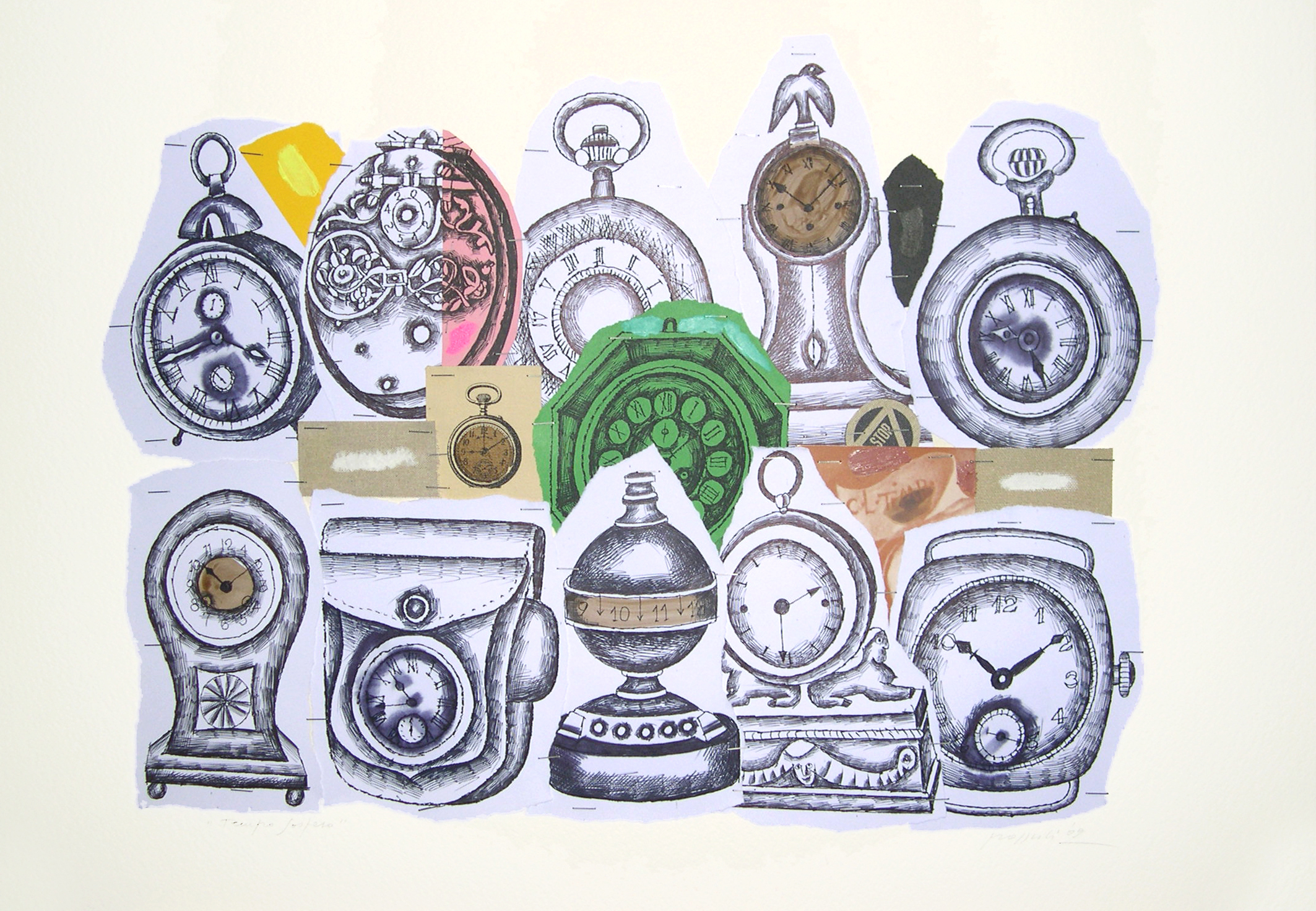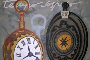 E se la “lancetta obliterata” fosse una personale madeleine proustiana? Il morso dato al piccolo dolce, superando il limite temporale, fa tornare alla mente un pezzo d’infanzia dello scrittore. Ogni occasione di “abbondanza di tempo”, se compresa, coltivata o stimolata da incontri positivi, quelli che anche la pittura (aiutata dal collage o l’assemblage di “oggetti ritrovati”) può trasmettere, è occasione di riflessione e di ricordo.