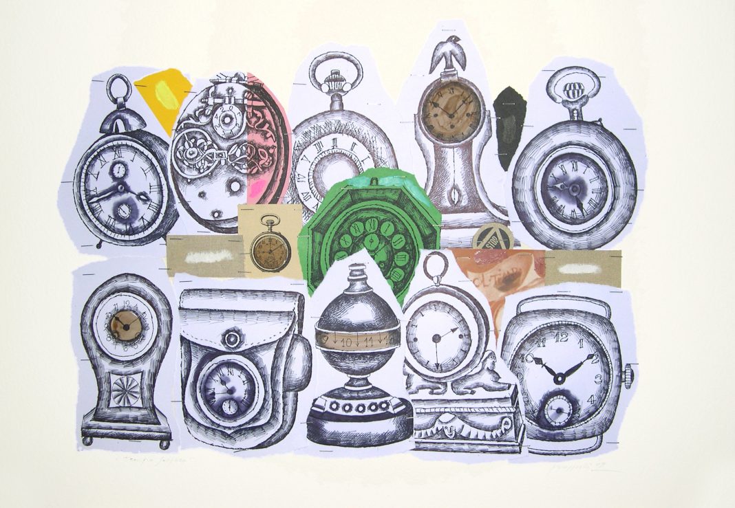 Altrettanto frequente è l’uso dell’assemblage, a cui Pozzati ricorre per il secondo importante lavoro legato al tema del tempo. Il tempo va d’intorno con le force, del 1978, presenta infatti l’accostamento di una vecchia sedia, ormai usurata, ad alcuni oggetti appartenuti al padre e ad alcuni prodotti dall’artista (“isole di cera spesse dove immagini affioravano come filigrana”). La seggiola è un’oggetto presente sin da subito nella vita delle persone ed è un arredo che può evocare la figura di chi l’ha utilizzata e consumata. È un arredo che, ad un certo punto, smette però di svolgere la sua funzione e si trasforma in un reperto archeologico del passato. Eppure, l’oggetto appartenuto ad una persona può essere tolto dalla stratificazione della polvere del tempo e riportato in vita con un gesto artistico che pone sullo stesso livello, letteralmente, epoche e ricordi diversi; il senso del lavoro, talvolta, non è solo nell’opera finita, ma è custodito nel valore dell’azione. Ma dove va a finire il presente quando è passato? Nella scrittura, secondo Proust, e grazie alla scrittura può essere recuperato. Possiamo infatti salvare il tempo e chi lo ha vissuto scrivendo, perché scrivendo fissiamo il tempo e, dal momento in cui siamo memoria, la scrittura attiva il ricordo che rende nuovamente presente il passato. Anche scolpire e dipingere, in qualche modo, sono azioni di recupero come la scrittura. Lo sapeva molto bene Pozzati (artista/scrittore) quando sottolineava l’importanza dell’appropriazione del tempo in quanto componente essenziale per la comprensione del senso autentico del passato e della sua irreversibilità. Con Tempo sospeso del 2008, un articolato ciclo pittorico, l’artista sfida la fisica sperimentando una smaterializzazione della misura del tempo. Tra pirografia, smalto e acrilico pastoso osserviamo una ricca gamma di orologi variopinti e variegati, antichi e moderni, da tasca, da polso, preziosi e comuni, ma soprattutto, spesso, senza lancette o con lancette ferme e “obliterate”. In tutti i casi, comunque, sul quadrante di questi orologi ribellati alla convenzione, il tempo è fissato, è fermo e non può più comandare, ma può essere ascoltato e percepito. Sospendere il tempo, in una società dominata dagli orologi, è la condizione indispensabile per poterlo apprezzare nuovamente. Pozzati, in qualche modo, lotta contro i tiranni di Herder e, riflettendo sui concetti di “quotidianità” e “esistenza” teorizzati dal filosofo Heidegger, cristallizza l’unicità, l’esclusività e l’importanza del “momento”.