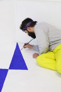 L’intervento di Alessio Barchitta a spazioSERRA si costituisce in un motivo geometrico disegnato sul pavimento le cui linee sono state tracciate spargendo del sale colorato di blu e bianco. Al centro compare la scritta “vorrei ci fosse una frase ad effetto, ma non ne valeva la pena, è già altro”. Espressione che risuona un po’ come una formula magica, custodendo in sé lo spirito di trasformazione continua. All’improvviso, l’avvio della macchina, un dispositivo progettato dall’artista stesso, e camuffato con delle foglie di palma blu, provocherà la trasformazione dell’opera stessa. L’installazione subirà un’interferenza, una modifica che distruggerà totalmente o in parte il disegno geometrico e la scritta.