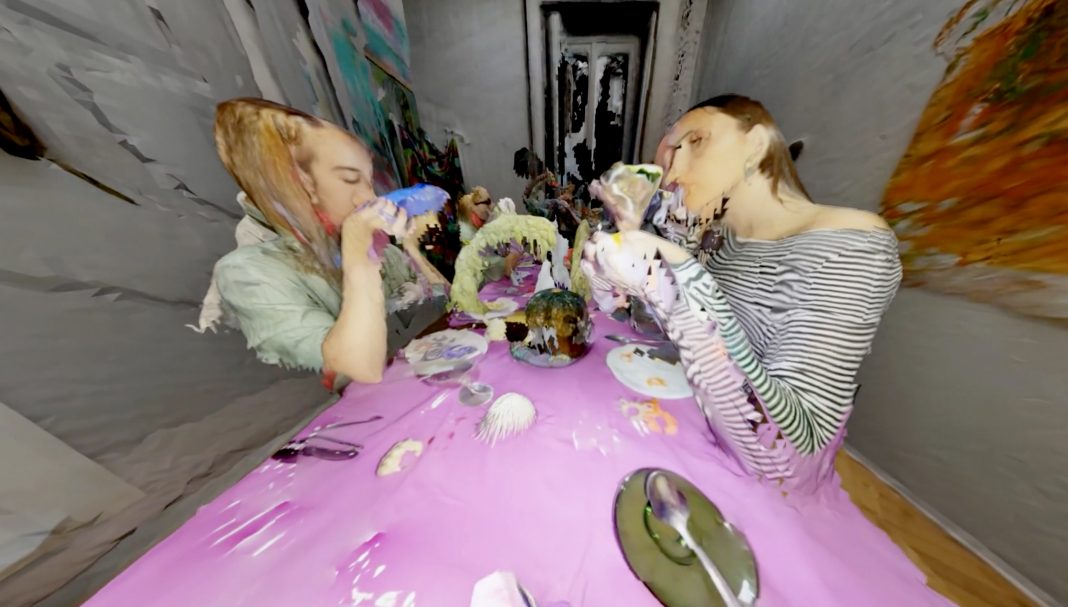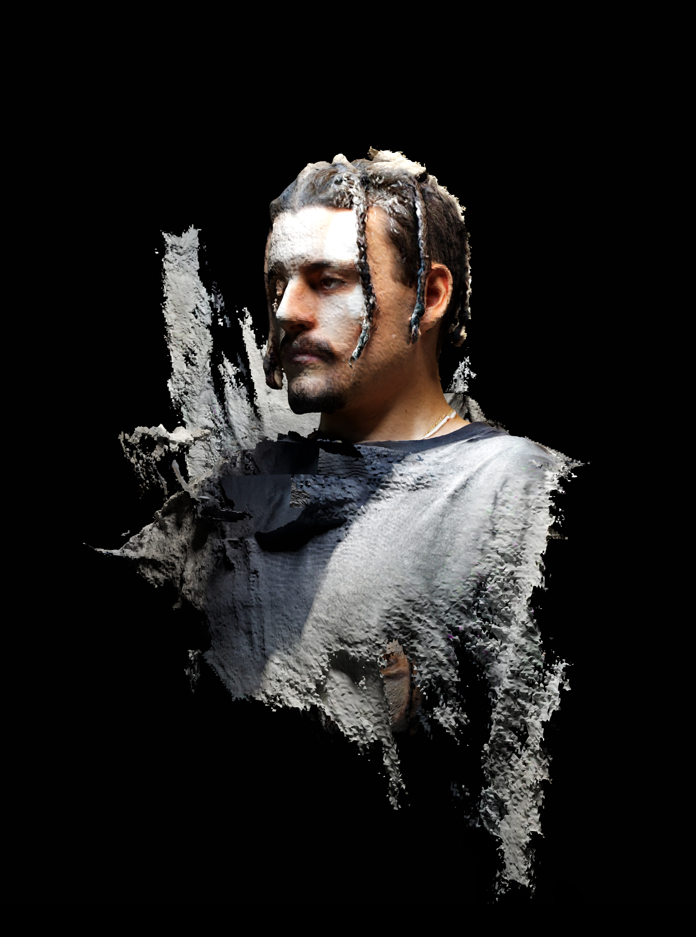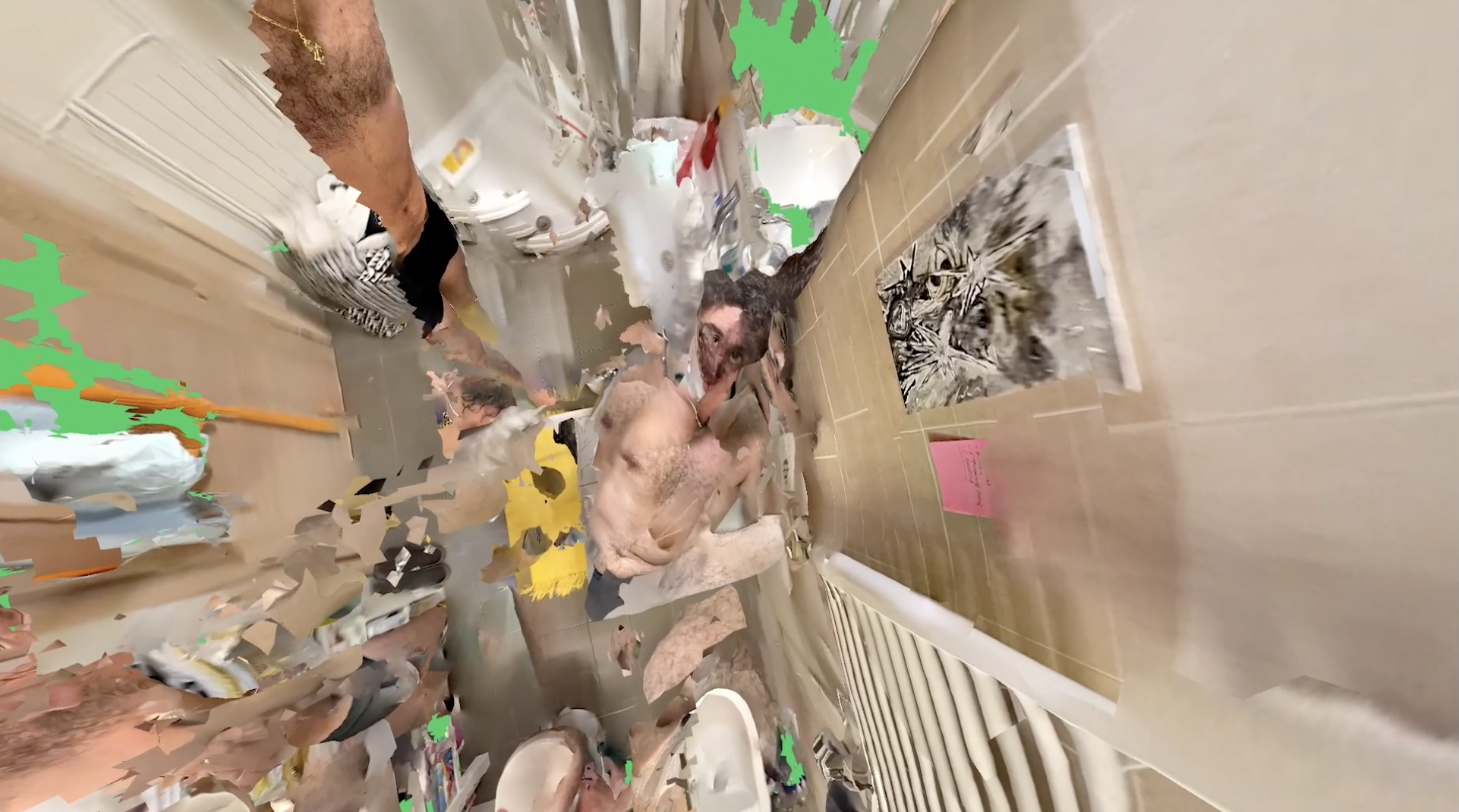 I due video posti uno accanto all’altro creano diverse relazioni organizzate su più livelli. La relazione più immediata è il confronto tra lo spazio reale e quello virtualizzato. In secondo luogo, ci accorgiamo subito dell'”errore” mostrato dalla fotogrammetria. Solitamente, infatti, non viene utilizzata in movimento, tanto meno se i soggetti stessi si muovono. La fotogrammetria si configura come uno strumento miope, capace di svolgere il suo compito con determinate accortezze. Trovo interessante spingere uno strumento ai limiti delle sue possibilità di utilizzo. Infatti, lo spazio mostra dei buchi e viene alterato. Inoltre, la texture si applica in modo del tutto surreale, ricreando di fatto un ambiente “Altro”, un luogo nuovo, virtuale. La stessa cosa avviene per la mia copia digitale, che diventa una rappresentazione parziale, un punto di vista che rispetta i limiti del dispositivo e del mio corpo stesso.