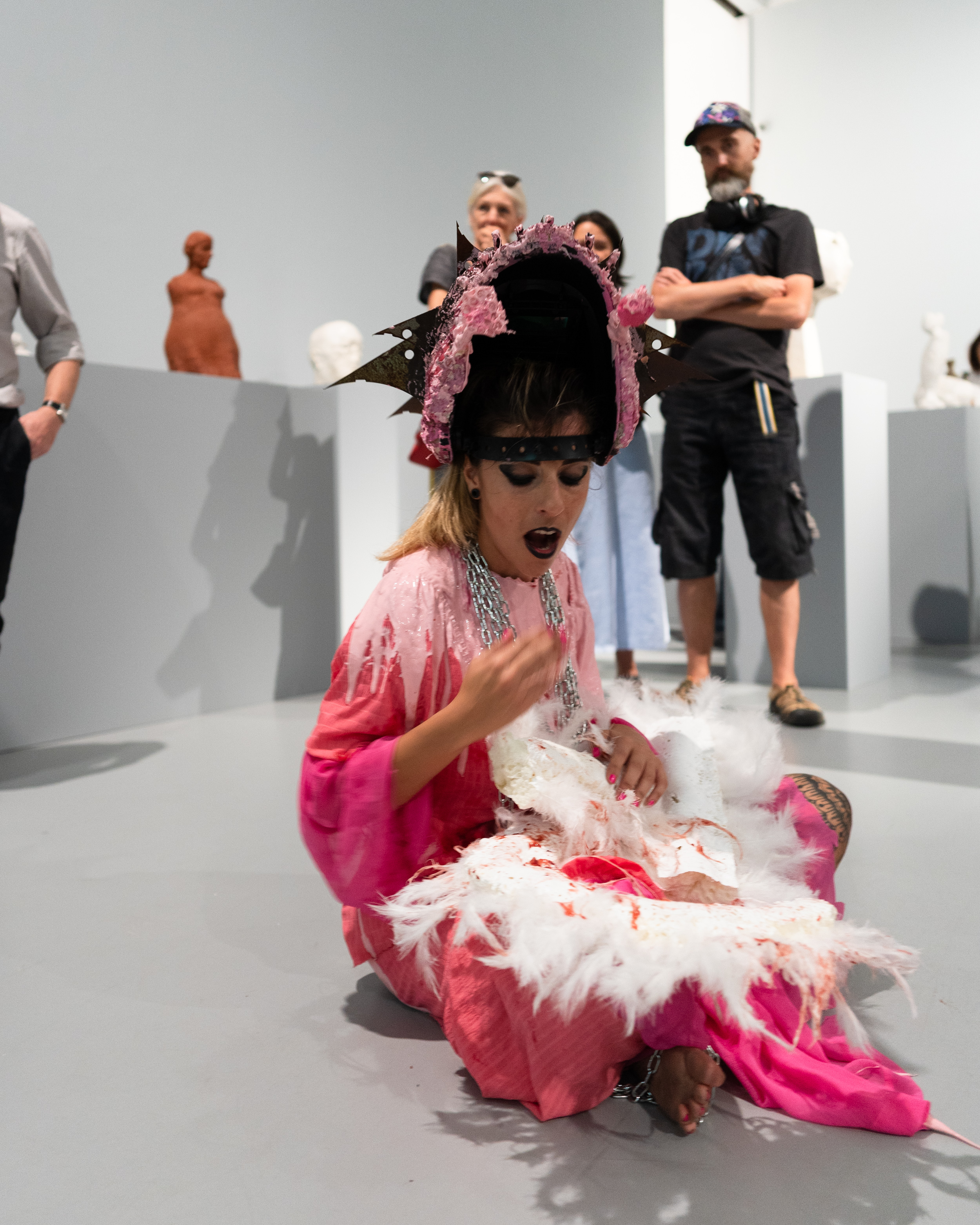«Sono una persona che non ama categorizzarsi in nessun contesto o forma, per questo motivo nei miei lavori emerge una volontà di ibridazione. Trovo che quest’ultima sia il sintomo di un nuovo fenomeno che predilige il deviante o il mutante rispetto alle versioni più convenzionali dell’essere vivente e che ci fornisce appropriate rappresentazioni culturali dei cambiamenti e delle trasformazioni che caratterizzano il nostro contemporaneo. Attraverso la pratica performativa e scultorea cerco di uscire dall’immaginario putrefatto del vecchio, dove la bellezza del corpo anomalo non era stata concepita».