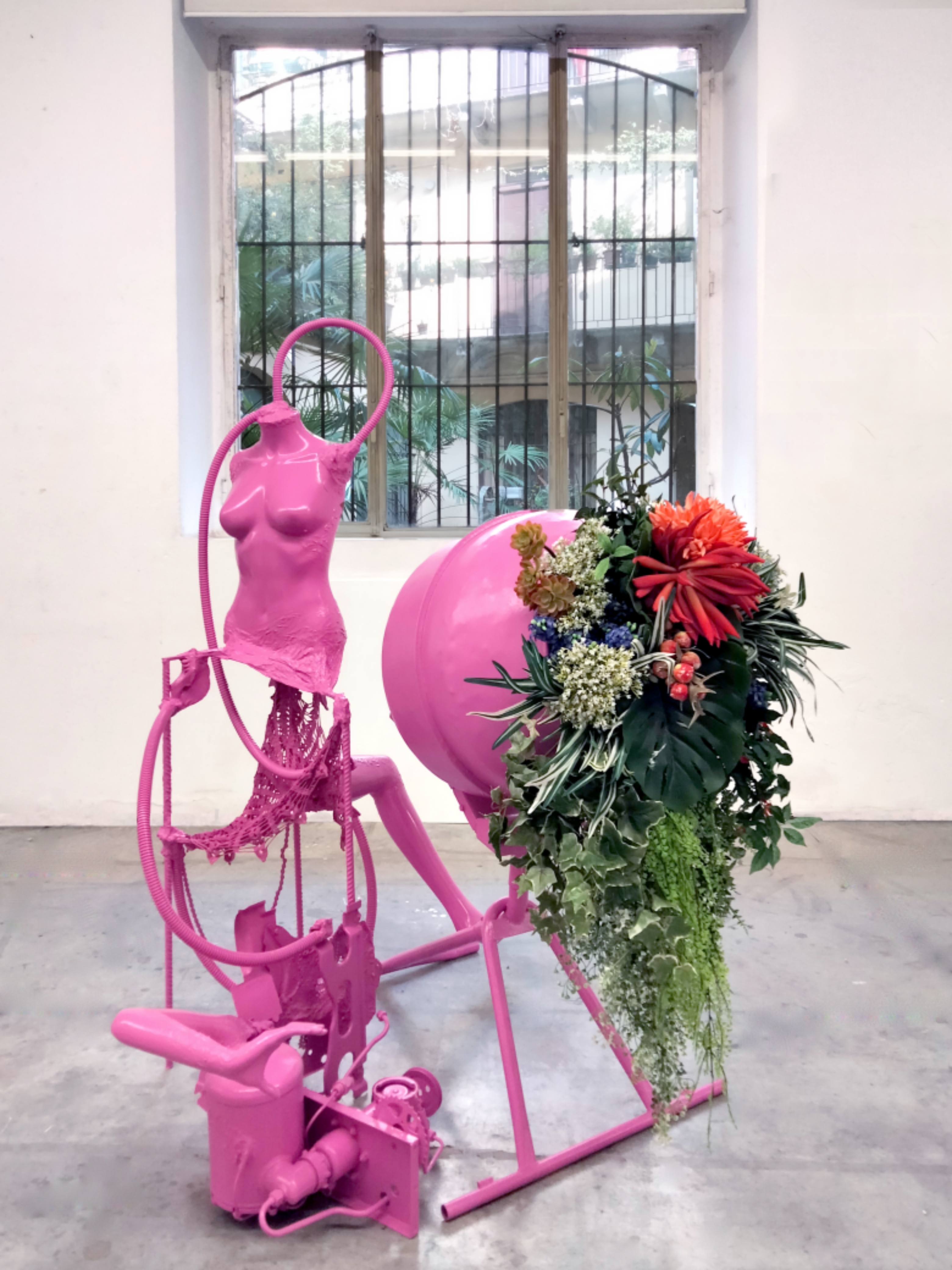 Penso anche a come il rosa ha da sempre accompagnato i miei lavori, soprattutto quelli scultorei e installativi. Anche in questo caso la volontà era quella di utilizzare uno stereotipo (quello che associa tale colore alla figura femminile) per raccontarne un altro, ovvero quello che associa la macchina all’universo maschile. Il risultato è stato un agglomerato di macchine sterili, improduttive, morte e rosa; a me questa cosa fa sempre sorridere».