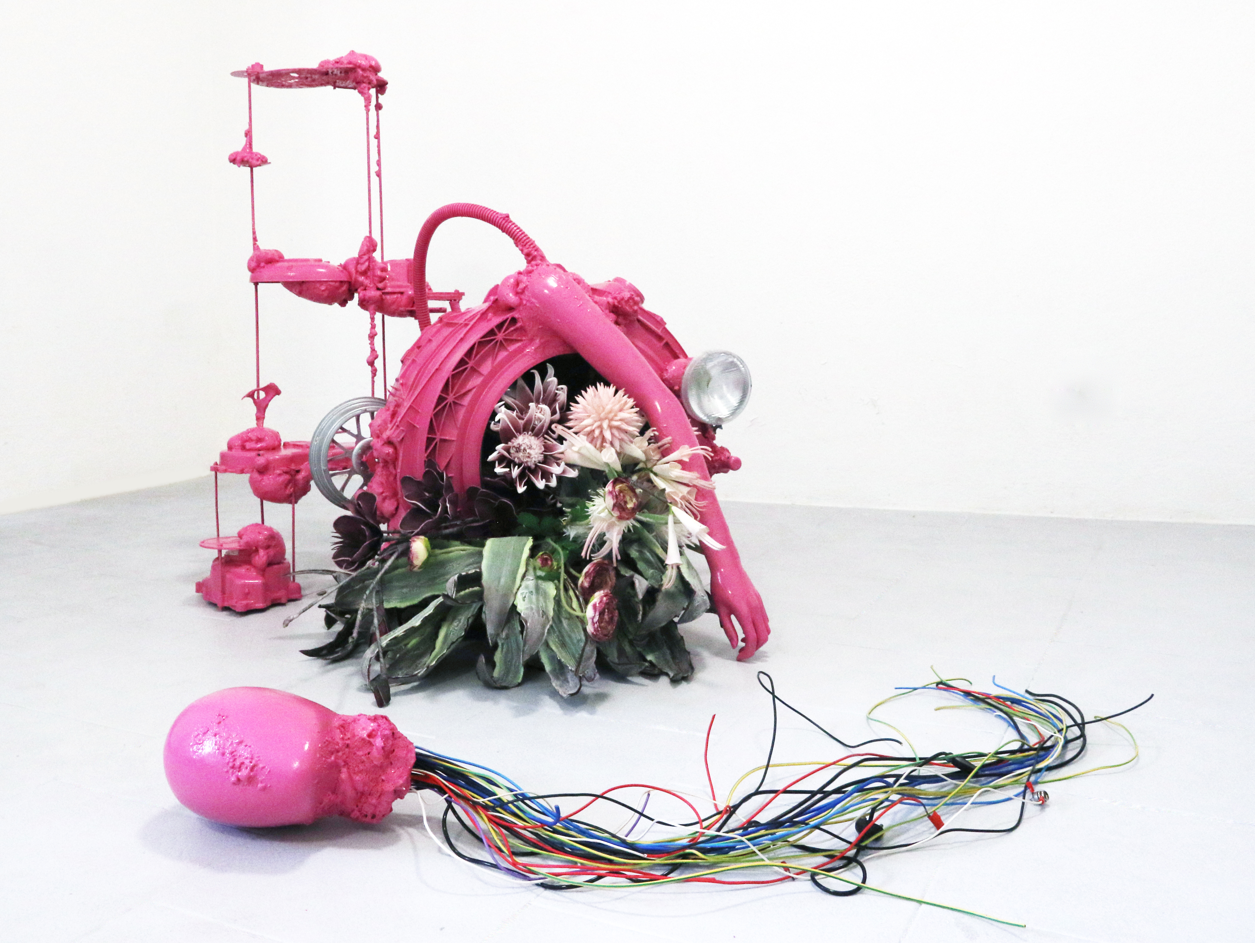 Penso anche a come il rosa ha da sempre accompagnato i miei lavori, soprattutto quelli scultorei e installativi. Anche in questo caso la volontà era quella di utilizzare uno stereotipo (quello che associa tale colore alla figura femminile) per raccontarne un altro, ovvero quello che associa la macchina all’universo maschile. Il risultato è stato un agglomerato di macchine sterili, improduttive, morte e rosa; a me questa cosa fa sempre sorridere».