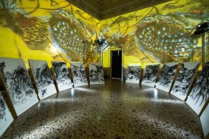 Proseguendo incontriamo l’installazione digitale di Wang Huangsheng, in cui le luci e gli ideogrammi evocano pensieri fugaci, ipnotizzando l’interlocutore che è chiamato ad interagire con l’opera e farsi condurre da un’esperienza sensoriale ed immersiva. Le sue opere sono astrazioni che catturano sensazioni veloci e transitorie.