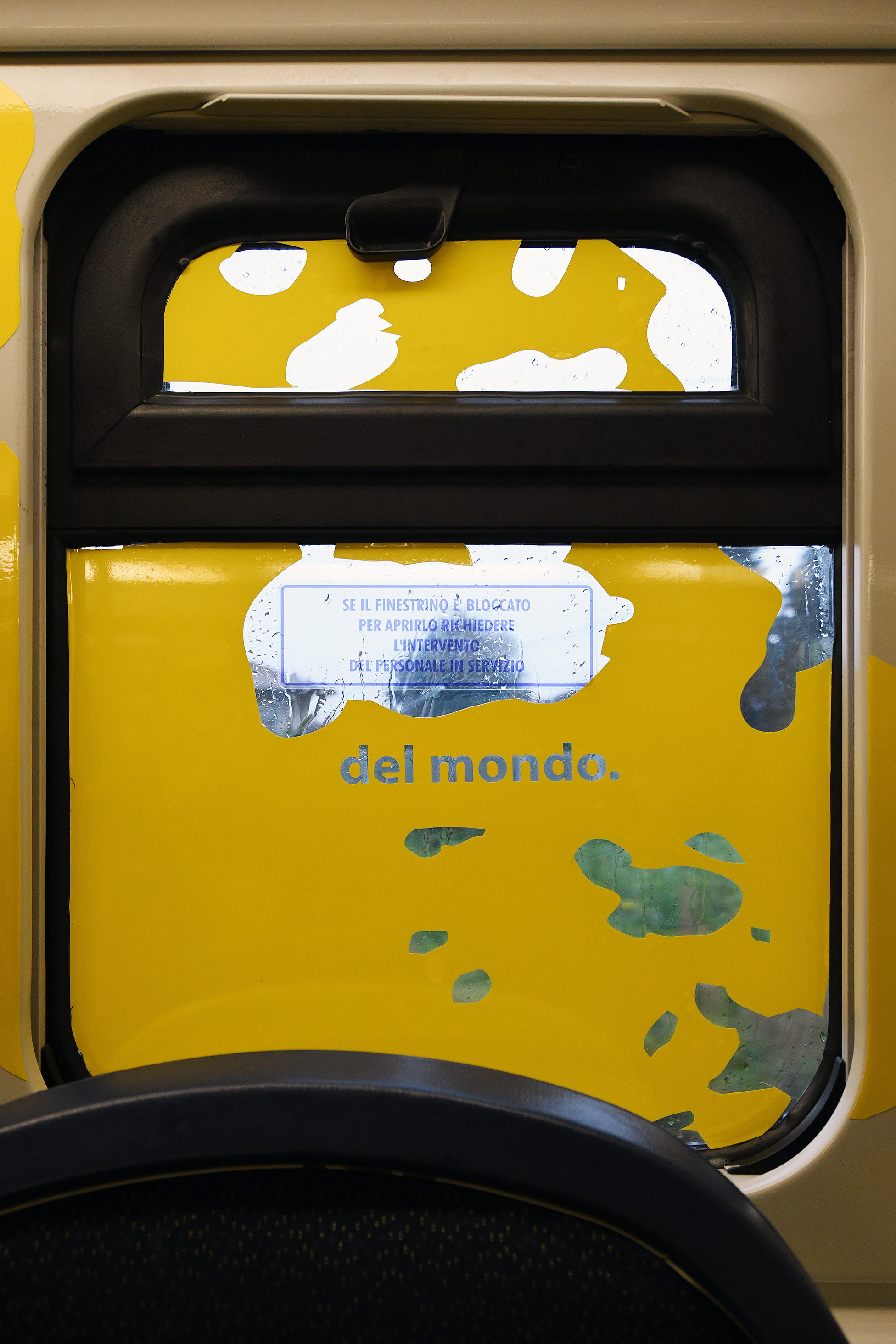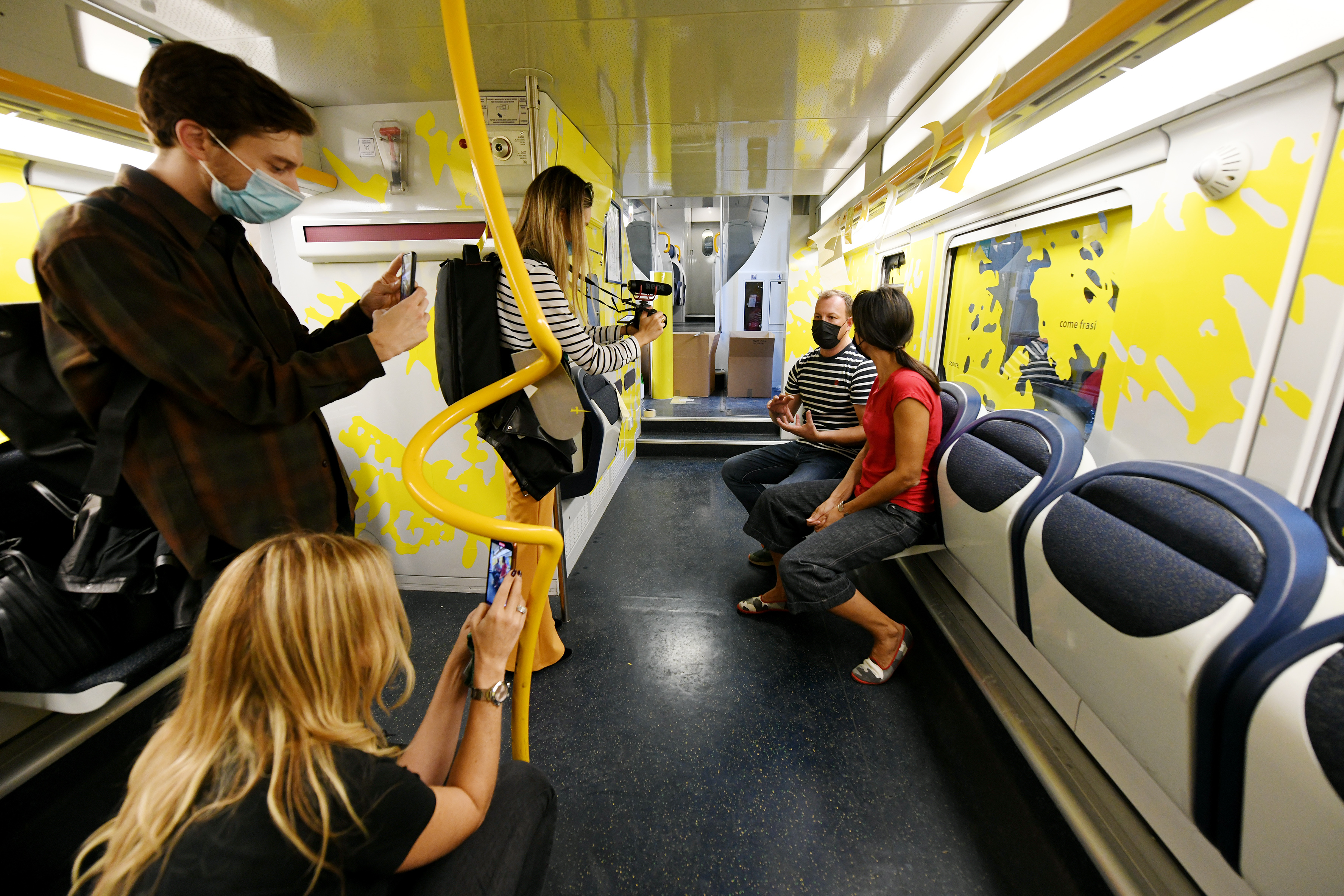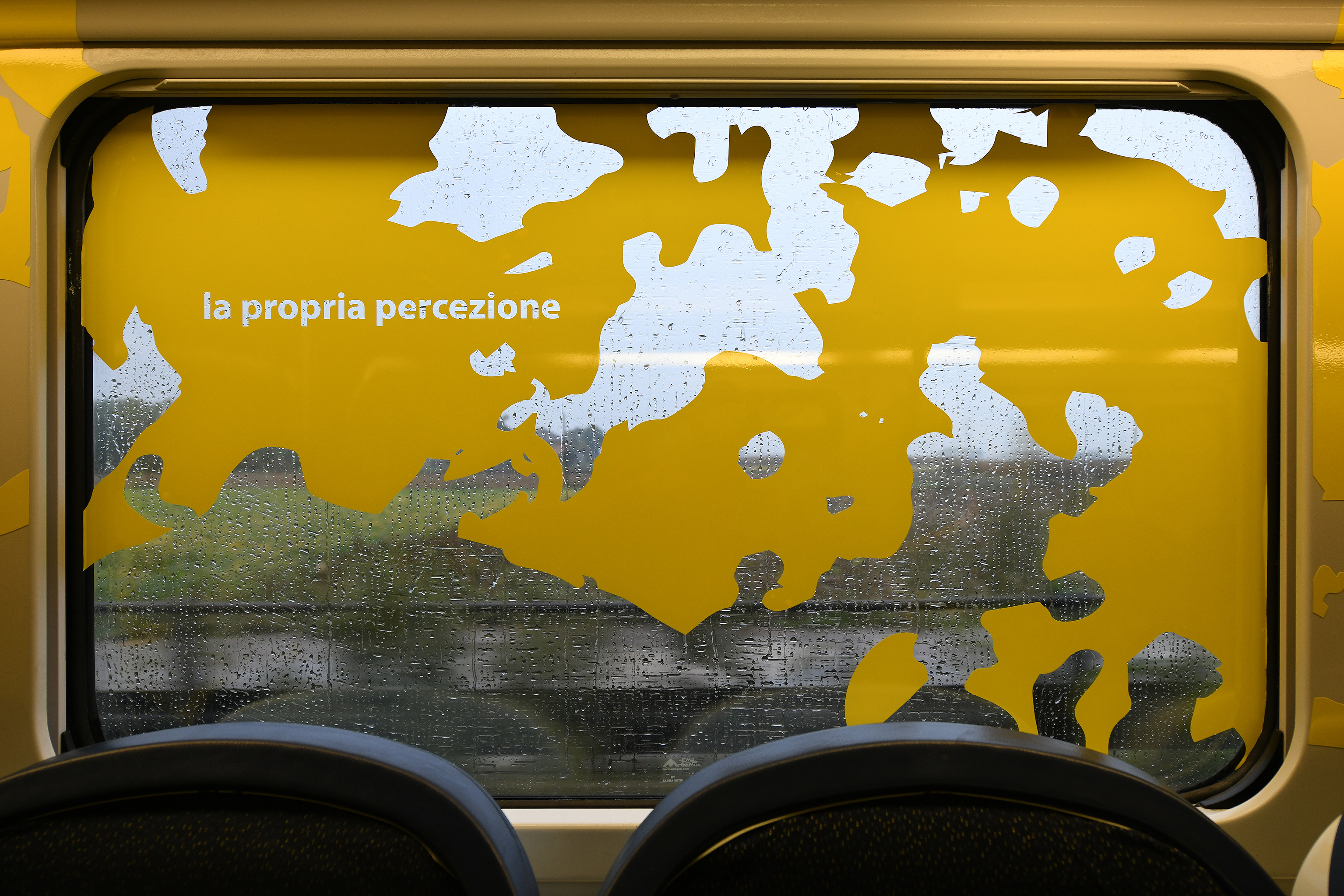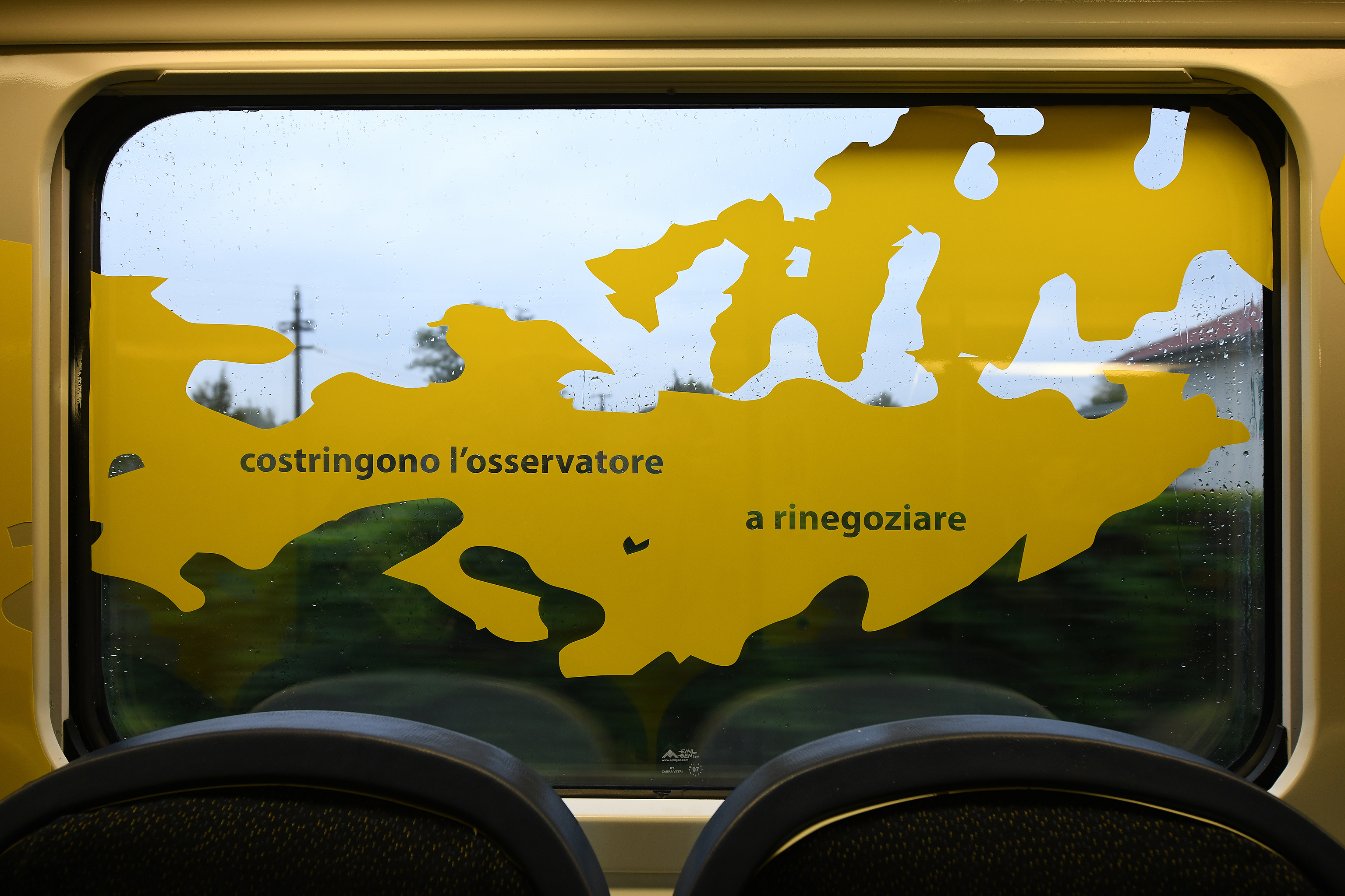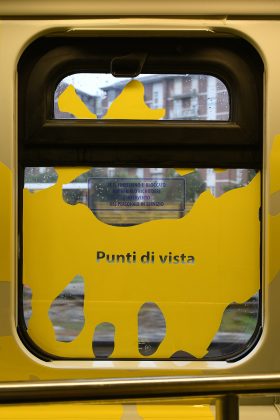 Scrive l’artista in una frase incastonata nel finestrino: “Si parte da una stazione normale per sviluppare letture multiple e sovrapposte”; e l’enigma è tutto lì, in quel rettangolo di vetro che mette in relazione lo spazio interno con l’esterno, dove le parole evocano passaggi di paesaggi in movimento. Scombinano lo sguardo le sue espansioni di giallo che occupano tutto il vagone, tracimano oltre la cornice del finestrino come i riflessi della luce naturale per disegnare altre prospettive fluide, in costante oscillazione fra ciò che appare come bidimensionale e ciò che non lo è.