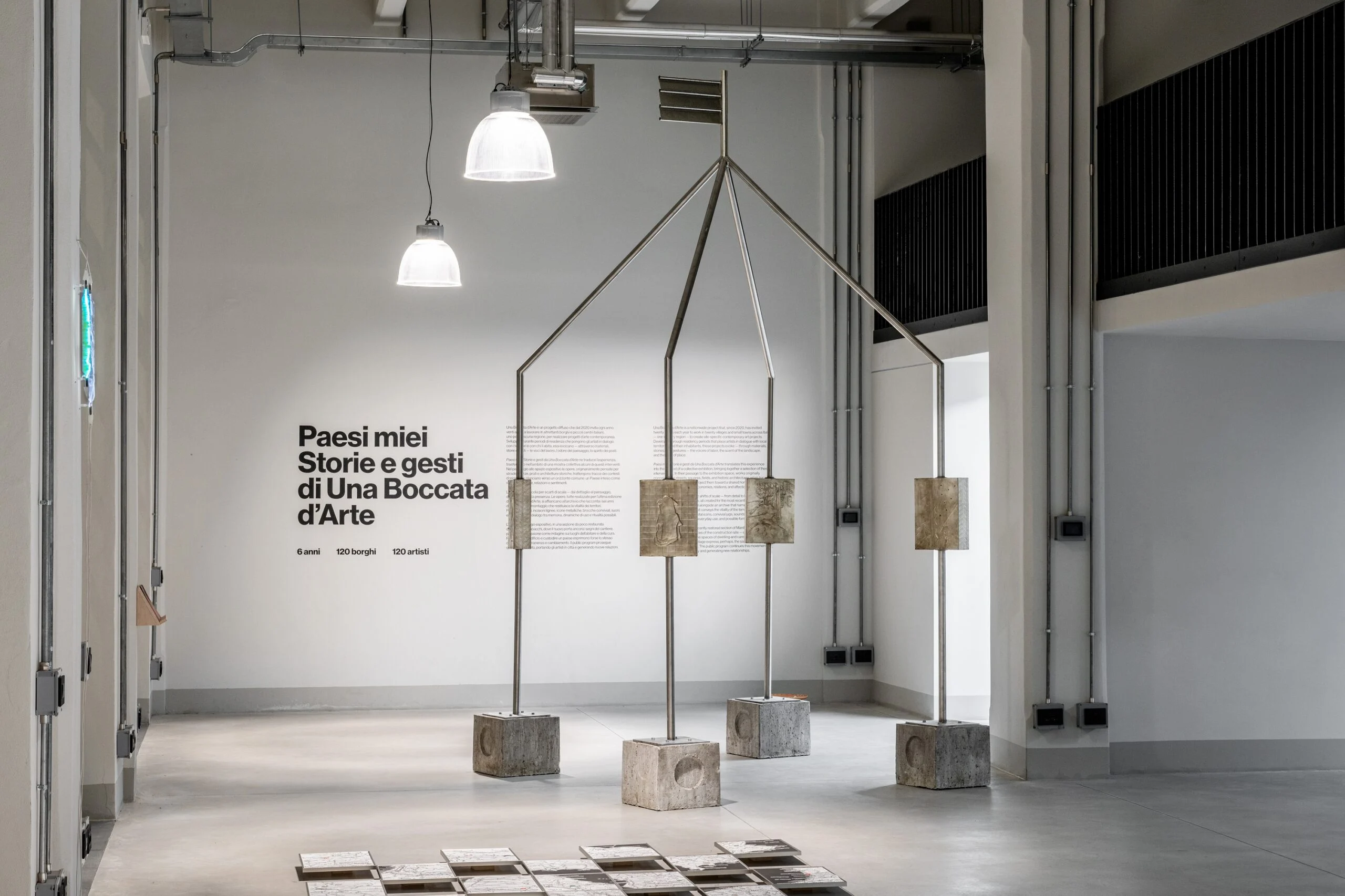 La mostra Paesi miei. Storie e gesti da Una Boccata d’Arte, visitabile fino al 21 dicembre presso Manifattura Tabacchi di Firenze, è un progetto che riflette su memoria, dinamiche di uso e ritualità possibili, dove il medium ritorna alla sua funzione principale di tramite, mediatore tra spettatore e opera. La collettiva, realizzata da Fondazione Elpis in collaborazione con Toast Project, si organizza attorno all’omonimo progetto diffuso di arte contemporanea che, dal 2020, coinvolge 20 artisti in altrettanti borghi italiani, portando in esposizione opere che sono concepite, principalmente, per spazi esterni, continuando la diffusione da cui sono emerse in fase di progettazione, anche dopo la fine della residenza. L’idea di utilizzare l’edificio B12 di Manifattura, recentemente inaugurato, come luogo di sosta di questo lavoro, è quasi un rito di passaggio: le opere non si fanno trovare in giro per lo spazio urbano ma accolgono il visitatore e lo proiettano in una dimensione locale e territoriale altra, per piccoli frammenti, instaurando un meccanismo di memoria relazionale.