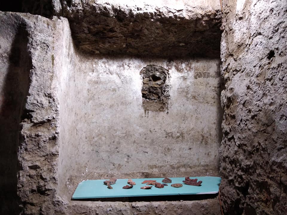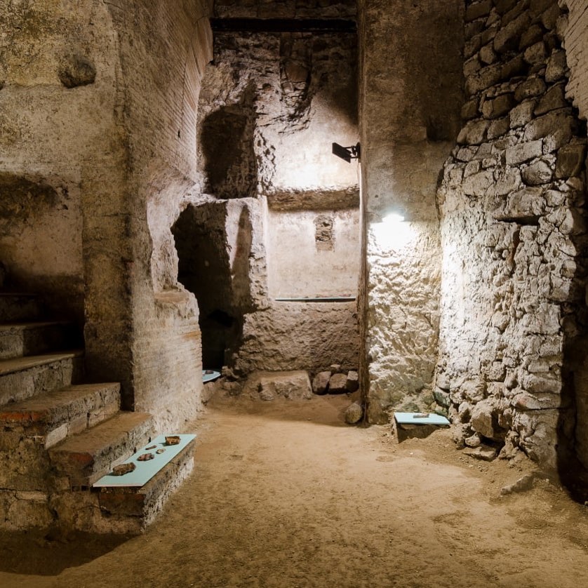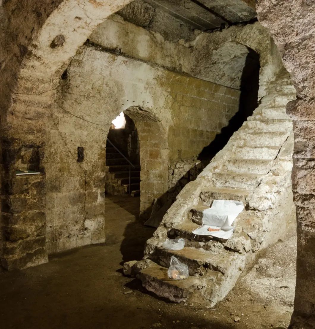 Come sempre avviene in città antichissime come Napoli, scendendo poche scale si attraversano secoli di storia, di materia morta e dimenticata, eppure un tempo vivida e respirante alla luce del sole, su cui si poggiavano visioni e sensazioni, concetti e percezioni ormai perdute. Ci si addentra così in un ambiente denso, intessuto da solidi piloni, adornati da ghiere di mattoni in laterizio e sostenuti da sorprendenti corpi in tufo e opera cementizia. Uno scheletro che ha agito da architrave del palazzo con discrezione, di nascosto e disvelatosi solo pochi anni fa, a seguito di un crollo. E dai lavori di recupero è emersa tutta la sapienza degli antichi costruttori, che tra queste camere segrete sapevano maneggiare concetti astratti come vuoto e pieno, peso e sostegno, forza e leggerezza con la stessa consapevolezza della semplice sabbia, malta e gesso.