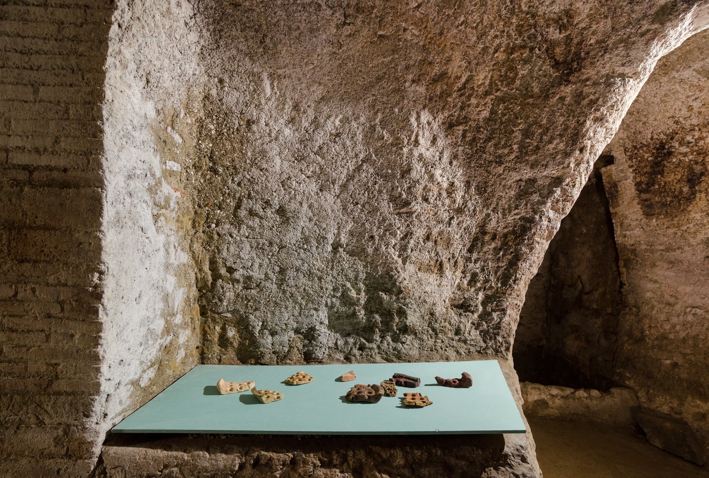 Doni diffusi, poggiati con delicatezza, tra ripiani e piccole edicole, su pannelli di cartongesso irrisori nella loro friabilità e temporaneità ma in grado di sfidare la possanza dei pilastri dell’acquedotto, che nonostante i secoli, la polvere e le crepe, rimangono viscere, sistema circolatorio di un potere assoluto e spettrale, di un Imperium sbriciolatosi sotto il devastante urto della terra, ma di cui è impossibile disperderne memoriae.