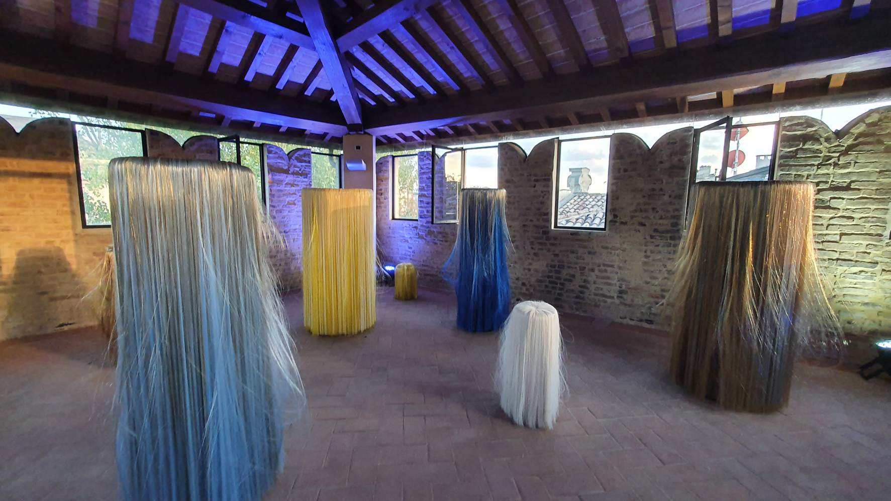 Camminando contaminando è invece un progetto site-specific di Francesca Pasquali allestito all’interno del Torrione Visconteo che crea un incantevole spazio immersivo costituito da truciolato di polistirolo e che, grazie ad una ricerca legata alle materie plastiche e all’utilizzo di tecniche antiche come la tessitura e l’intreccio, realizza ambientazioni uniche e dal potente impatto visuale.