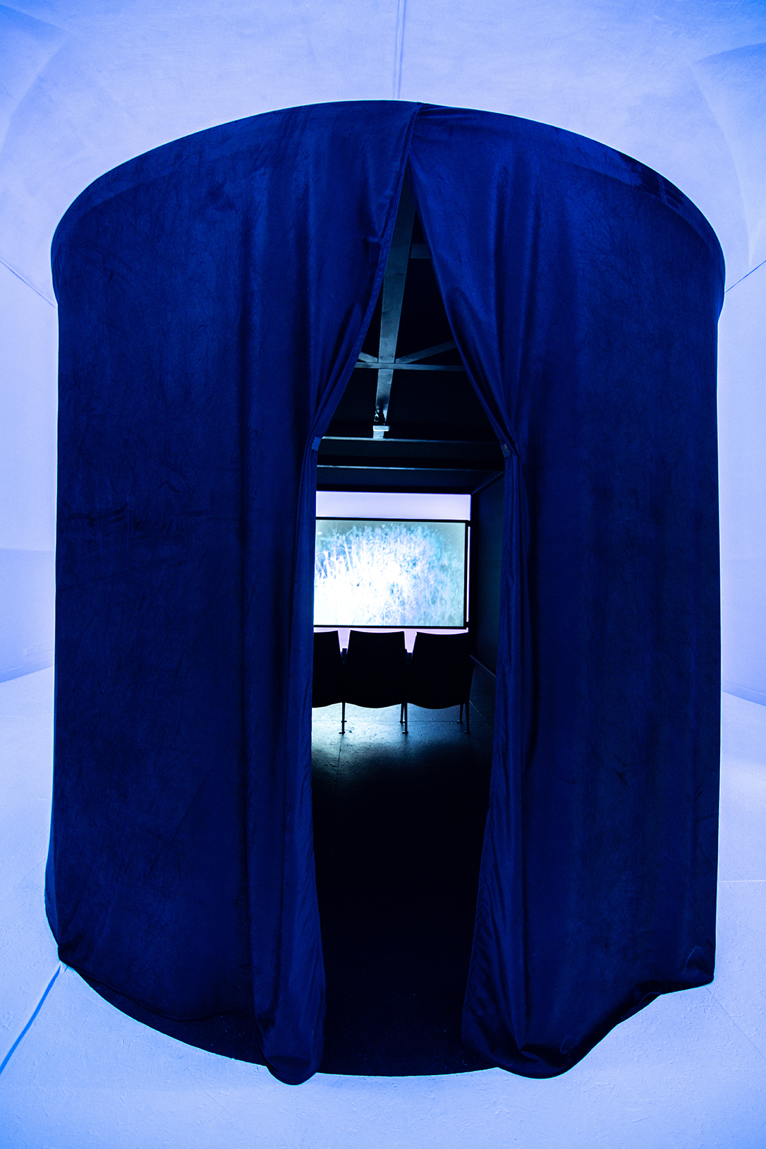 Fuori di lì però corre la notte delle lucciole. Dopo aver ipotizzato almeno una soluzione alternativa (l’artista ci racconta di un peep-hole, tanto per dire), Curnier Jardin alla fine ha scelto d’istallare un black box nel white box della Pinksummer. Un mini cinema dedicato a Fireflies, video che con prepotenza sfoggia immagini e suoni, per restituirle sotto forma di effetti personali: Dall’asfalto-black carpet dove i corpi brillano illuminati dai fari delle auto, all’aperta campagna chiusa nel suo buio. In mezzo alla vegetazione incolta le lucciole sono lucciole, e non smettono di far brillare la loro prorompente presenza.