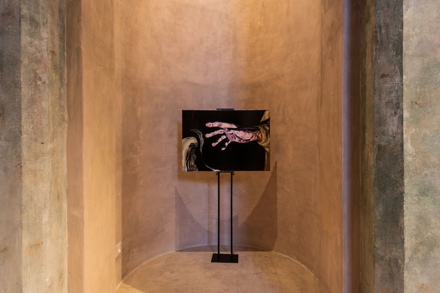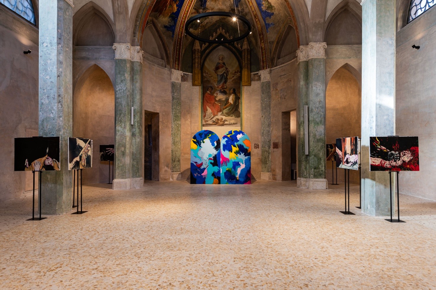 «Non ho cercato né la continuità né la rottura. Una chiesa è uno spazio carico di memoria: secoli di immagini, di riti, di silenzi, di preghiere. Quando un’opera entra in un luogo così non può fingere che tutto questo non esista. Ma allo stesso tempo non è necessario ripetere quel linguaggio. Mi interessa piuttosto creare una zona di attraversamento. L’opera non illustra un contenuto religioso, ma si colloca in quello spazio come un campo di esperienza. La pittura non sostituisce l’immagine sacra e non la contesta. Piuttosto apre un’altra possibilità: un luogo in cui lo spettatore può fermarsi, attraversare, sostare. In questo senso il dialogo con la tradizione avviene in modo indiretto, quasi sotterraneo».