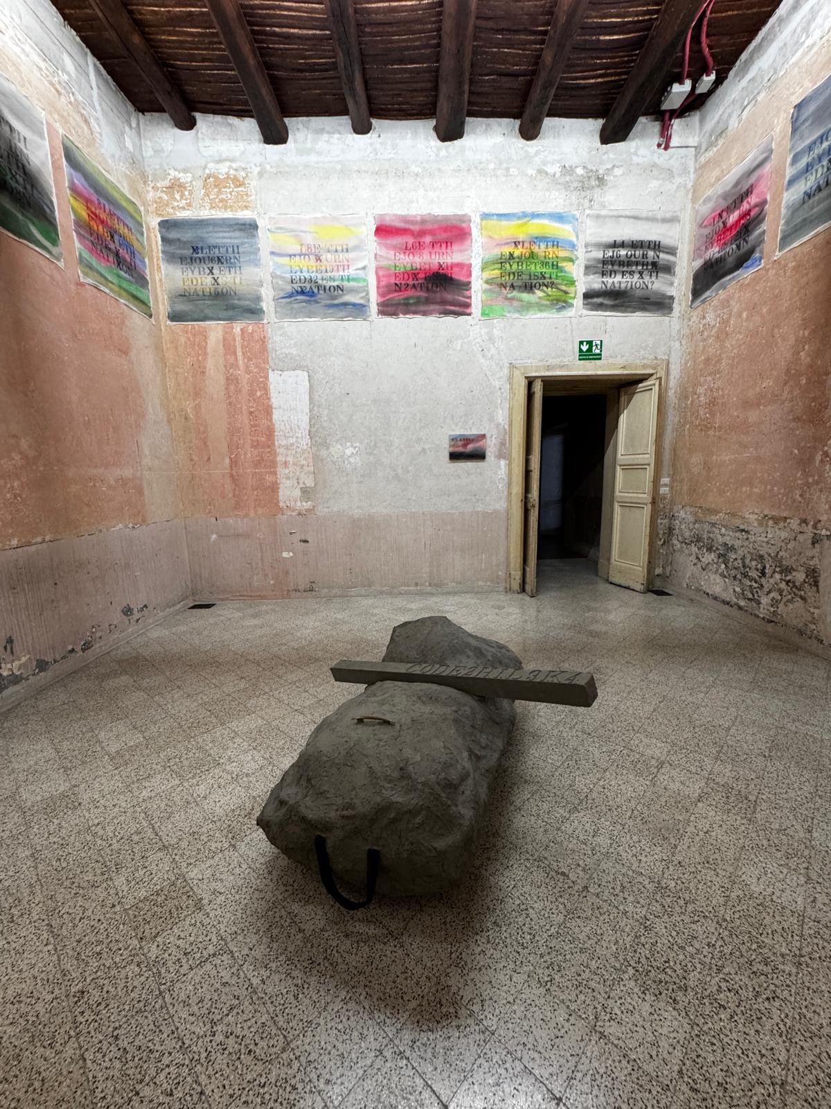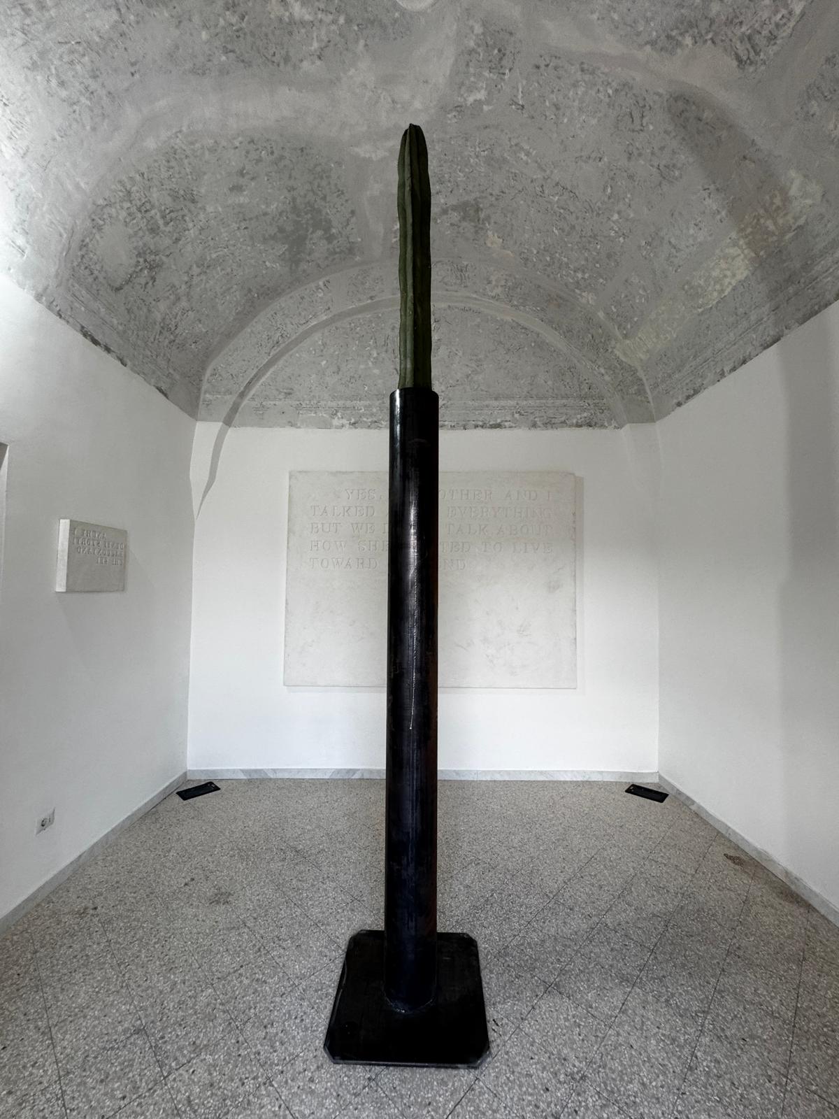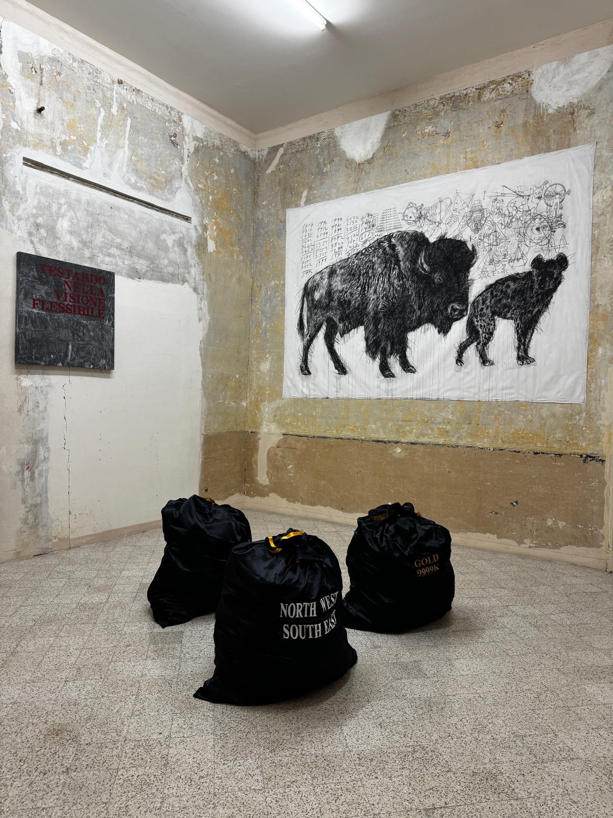 Mobili a mezz’aria attraversati da pale rotanti, un cactus come emblema di resistenza, sacchi metaforicamente colmi d’oro, una botola che è anche cancello chiuso da una moltitudine di lucchetti, si pongono come rebus visivi, interpretabili non in sé ma nelle molteplici connessioni che li legano tra loro e con le iscrizioni appese alle pareti. Opere che introducono a una dimensione intima e riflessiva, che non chiudono il percorso ma lo mantengono costantemente aperto, interpretabile in modo plurimo. Anche le superfici segnate dalle lettere, le frasi incise come ferite leggere, negano qualsiasi conclusione definitiva, lasciando il racconto sospeso.