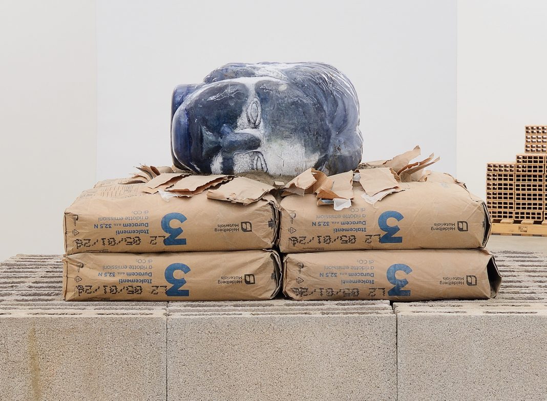 In dialogo con l’artista Stefano Canto, a margine della mostra Sogno di Pietra presso Màteria, a Roma. Entrando in galleria troviamo sacchi di cemento, foratini, mattoni di diverso genere e altri tipi di materiali edili, tutto poggiato su pallet di legno. Sopra ogni pila di materiali si trovano posizionate delle teste di ghiaccio trattate con coloranti e ossidi, tutte di colorazioni diverse.
