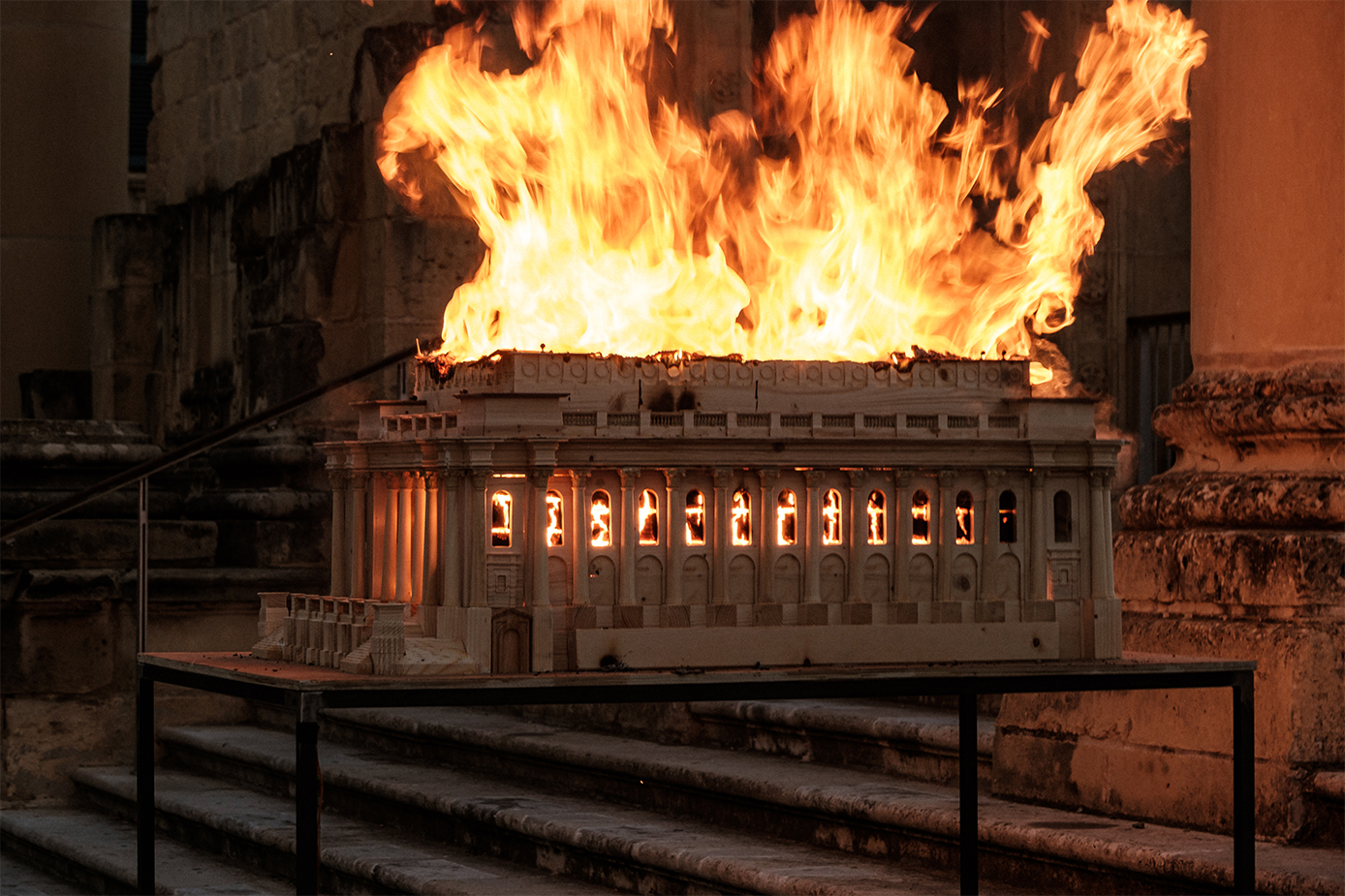 Austin Camilleri: «La performance vera e propria ha avuto luogo la mattina presto, molto prima dell’alba. Erano i primi giorni di febbraio. Non sapevo che il mio gesto – da cane sciolto – di bruciare i simboli del potere, della cultura e dell’architettura sarebbe stato amplificato tre settimane dopo, ma in realtà è il potere che brucia le città degli underdog».