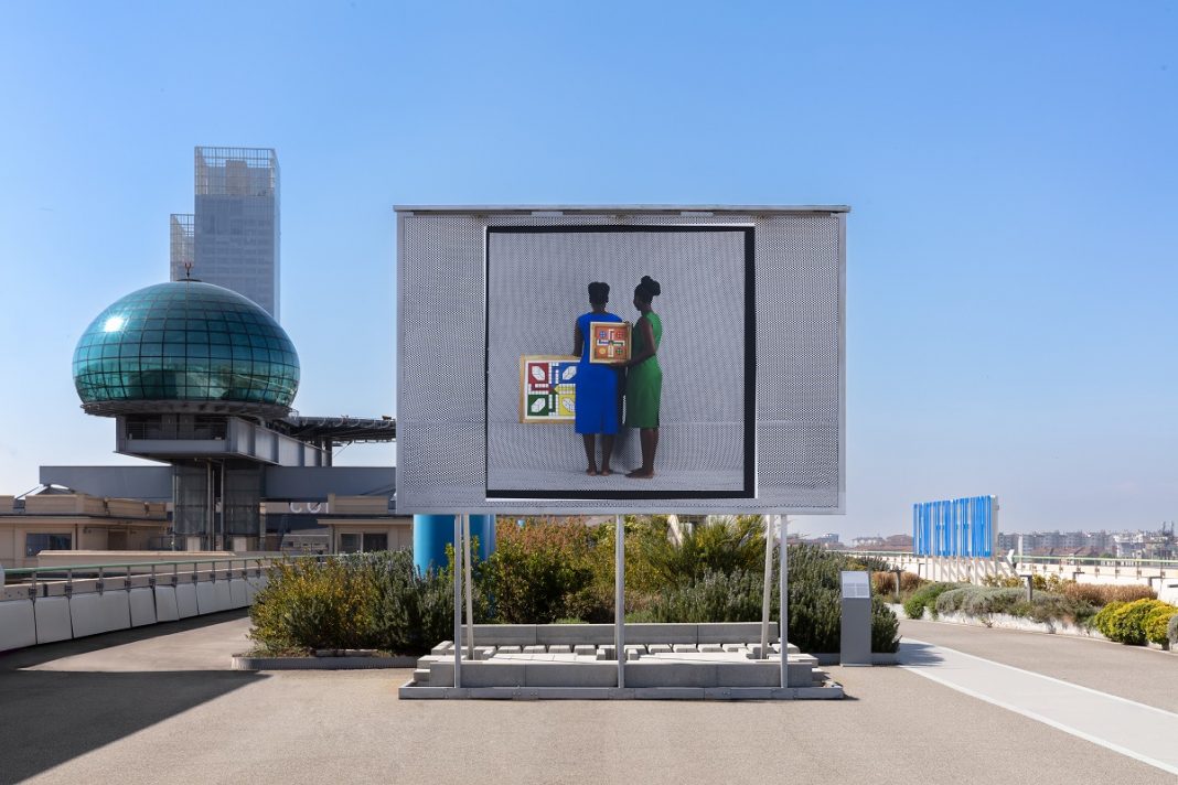 Infine, percorrendo la pista a cielo aperto, una grande fotografia di Silvia Rosi (1992), ispirata alla tradizione ritrattistica dell’Africa occidentale, è installata su una billboard. Omissions (2025) potrebbe sembrare una foto proveniente dall’album di famiglia dell’artista ma, attraverso la sua simbologia, intende farsi universale e riportare alla memoria il passato coloniale del suo continente d’origine. Due donne ritratte di spalle tengono in mano un tabellone del Ludo, un gioco nato in India e stato portato in Europa dagli inglesi. Conosciuto in Italia come Non t’arrabbiare, diventa per l’artista l’emblema della connessione culturale e sociale tra Europa, Asia e Africa. Le due donne, al contempo giocatrici e pedine, interrogano la comunità su ciò che viene consapevolmente dimenticato o ricordato dalla storia che viene tramandata.