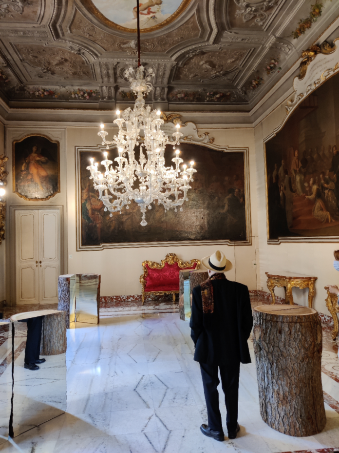 Una mostra che appaga visivamente e che illumina su la vicenda umana del Boncompagni e il suo potere temporale e consente di ripercorre le decennali concettualizzazioni di Pistoletto, attraverso i nuclei della sua produzione. Installazioni, da Porta – Segno Arte, 1976 – 1997 a Il Terzo Paradiso, nella versione con panni smessi del 2017, tra le altre, e fotografie, dalla serie La conferenza e Raggi di persone 1975, incastonati in ambienti-gioiello. Con interventi inediti, volutamente modulati per l’occasione della mostra, come Alberi – Divisione e moltiplicazione dello specchio, progetto che il Maestro porta avanti dal 1973.