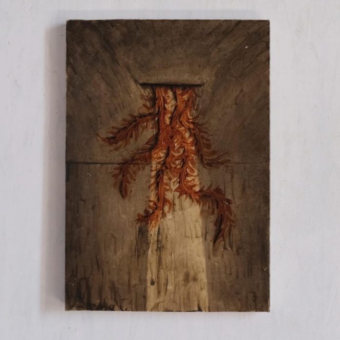 La composizione dell’opera è percorsa da fasci luminosi di prese d’aria che inscenano, con la loro traccia diafana e violenta, la veduta di un caliginoso ambiente sotterraneo. Dalla fessura si spandono le radici di una vegetazione spontanea, forse più simile a un ibrido che riguarda la natura: un corallo, un tentacolo, un arrampicante, insieme all’incognita della propria involuzione.