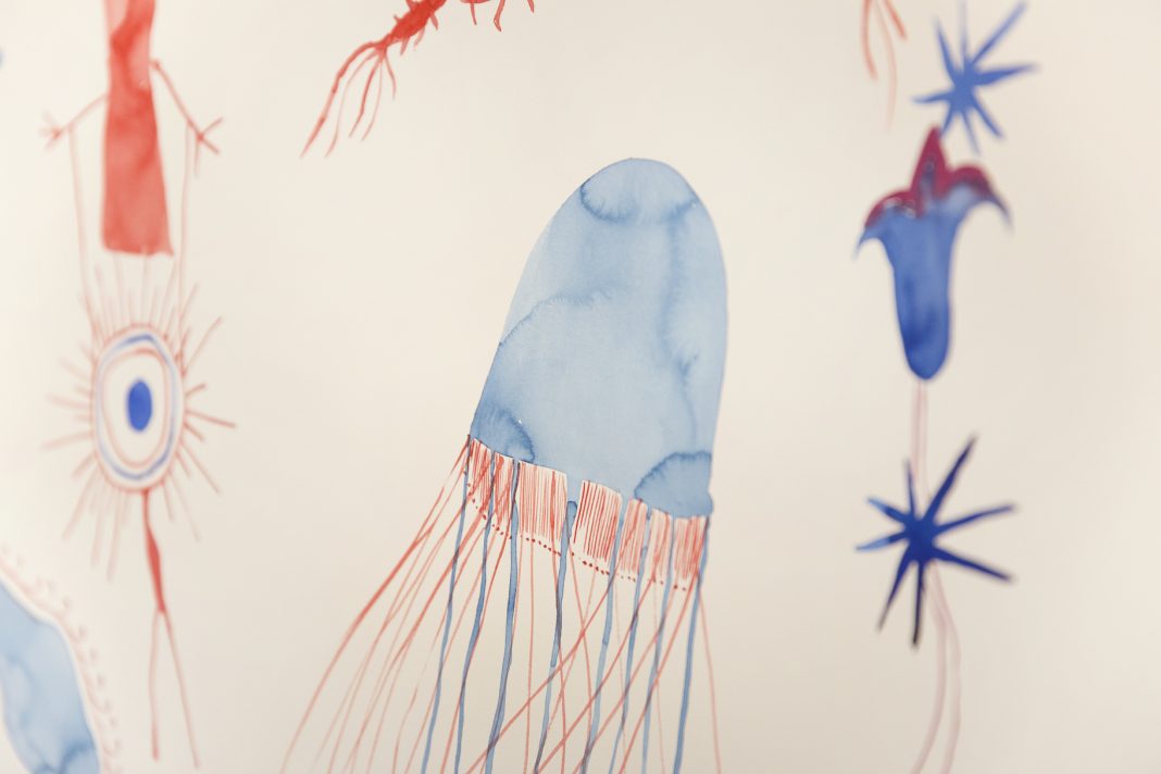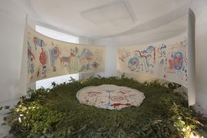 Laura Cionci lavora sulla cura, sulla relazione e sulla forza simbolica ed energetica di piante e animali. Ha creato un ambiente fatto di elementi vegetali e un racconto in forma di acquerello, un orizzonte visivo in uno spazio aperto allo spirituale e al sociale. Un coinvolgimento all’interno di un percorso fisico ma dal carattere quasi onirico: Stato di Grazia / Moto Perpetuo, un invito alla scoperta della simbologia degli animali guida. “La guarigione del corpo passa anche attraverso la cura dell’anima e i sogni”.