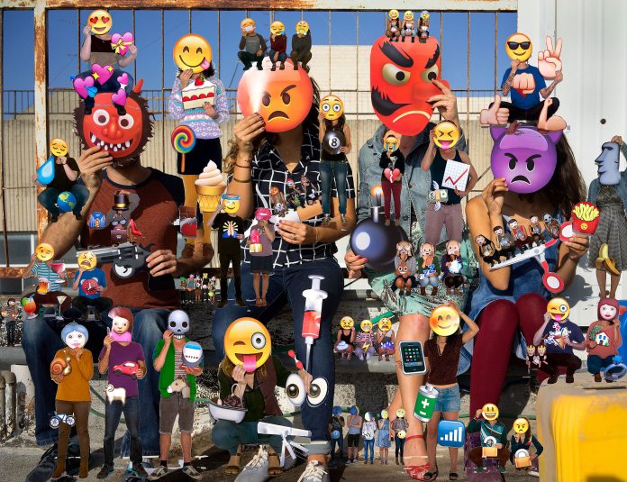 L’angolano Edson Chagas si traveste con buste della spesa rovesciate sulla sua testa e sembra preso in ostaggio dalle pubblicità, icone, oggetti, marchi dell’Occidente stampati sulle buste. Sembra un controcanto rispetto all’opera di Xhafa. Fa da trait-d’union l’opera della brasiliana Laura Lima, infatti se da una parte le sue maschere-paesaggio sono tele da indossare e mostrano i condizionamenti dello sguardo, dall’altro le sue rigide Máscaras Lousas (2010), che lo spettatore può dipingere con il gesso, ricordano l’arte concreta brasiliana. Poi ci sono delle maschere immagine: dai collage di John Stezaker dove delle cartoline nascondono il viso di attori hollywoodiani alle maschere fatte di lamelle prive di orifizi con solo il naso dipinto d’oro di Sabian Baumann alle inquietanti facce di Mélodie Musset tutte completamente ricoperte di sassi. L’installazione di Mike Nelson ha un’alta valenza iconica: un casco giallo i cui orifizi simulano un teschio sostenuto da un fragile bastoncino. L’artista mette insieme in modo fulminante l’originaria idea di maschera con quella di persona e il vuoto assoluto che apre l’immagine con la morte. Aneta Grzeszykowska e Amanda Ross-Ho svelano in chiave perturbante l’uso cosmetico della maschera. Una declinazione che si trova anche nelle maschere pelle o nelle maschere apparecchiature di tortura dei quadri rispettivamente di Cecilia Edefalk e di Markus Schinnwald. Un uso pop e ironico della maschera infine è rappresentato dal grande collage con personaggi che al posto del viso hanno gli emoticon di Olaf Breuning.